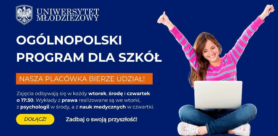 Pragniemy umożliwić młodym ludziom realizację ich pasji poprzez dostarczanie inspirujących zajęć pozalekcyjnych. Program będzie realizowany przez 3 miesiące do połowy czerwca, każda lekcja będzie trwała około 45 minut, będzie się odbywać około godziny 17 w wybrane dni tygodnia (wtorek, środa, czwartek). Zapraszamy szczególnie uczniów klas siódmych i ósmych, zwłaszcza tych, którzy kiedyś planują studia prawnicze lub medyczne. Osoby zainteresowane udziałem w projekcie proszone są o podejście do biblioteki po loginy. Szczegóły na stronie https://uniwersytetmlodziezowy.edu.pl/szkoly-i-placowki-oswiatowe/
