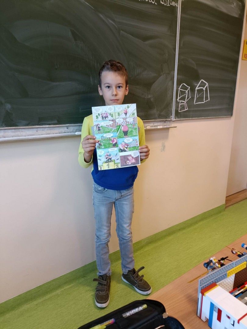 Pole, las, woda, wieś… Nadszedł czas – miotło nieś! Uczniowie z klasy 4A zaprezentowali na lekcji języka polskiego komiksy, które stworzyli na podstawie lektury „Kajko i Kokosz. Szkoła Latania.”. Zatroszczyli się o szatę graficzną swoich prac, wykazali się swoimi zdolnościami plastycznymi oraz twórczymi. Niektórzy uczniowie zaproponowali własny sposób realizacji zadania – zaprojektowali książki, przygotowali projekcję filmową. Ponadto dzieci udowodniły, że potrafią w odpowiedni sposób wyrażać różne treści w komiksie (m.in. poprawnie zapisywać dźwięki, krzyk, myśli bohaterów, wypowiedzi narratora, wypowiedzi grupy osób oraz wypowiedzi bohaterów).