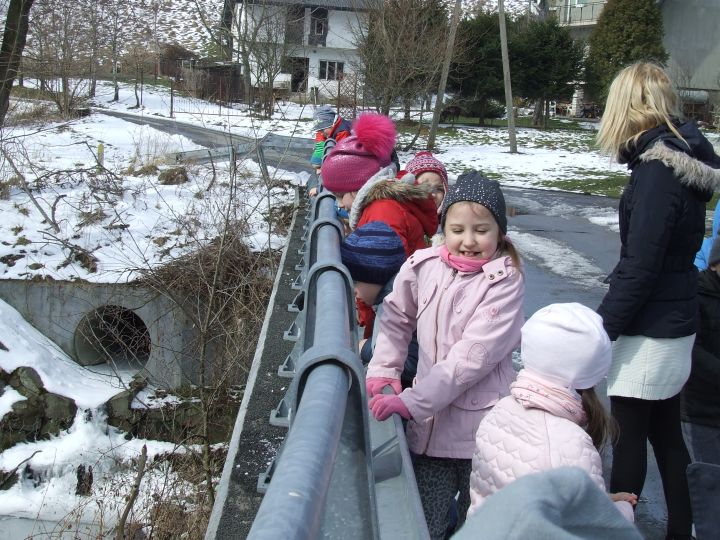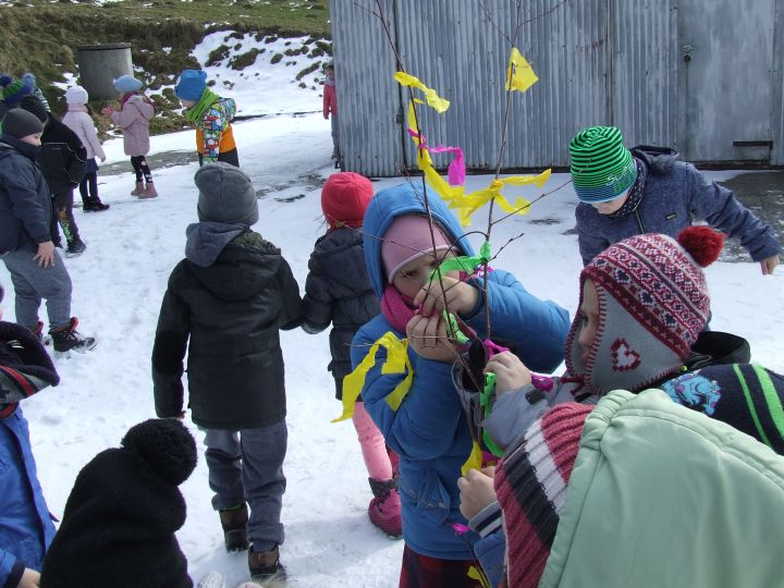 Później uroczyście witały Wiosnę, strojąc bibułą - gaiczek. Mimo chłodu, leżącego wokół śniegu przedszkolakom cały czas podczas spaceru towarzyszył ciepły, radosny nastrój. Mamy nadzieję, że Wiosna dzięki ich staraniom zawita już na dobre. Okazało się nawet, że jeszcze tego samego dnia zaświeciło mocniej słońce. Hura.....!
