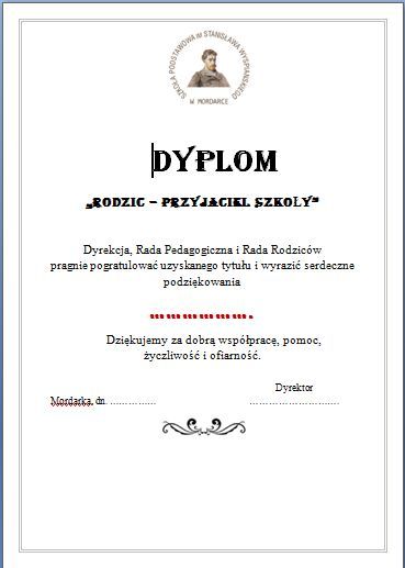 Komisja, w skład której wchodzili: Dyrektor, przedstawiciele Rady Pedagogicznej i Rady Rodziców docenili Państwa zaangażowanie w działania szkoły, te obowiązkowe i te dodatkowe. Wzorowo wypełnialiście Państwo obowiązki rodzica. Wiele dodatkowych działań inicjowaliście, byliście Państwo ich realizatorami i niejednokrotnie sponsorami. Nie sposób wyrazić słowami wdzięczność za Państwa pracę na rzecz społeczności szkolnej. Myślimy jednak, że beneficjenci Państwa starań, czyli uczniowie wyrażą swoją wdzięczność właściwą postawą i wysokimi osiągnięciami.