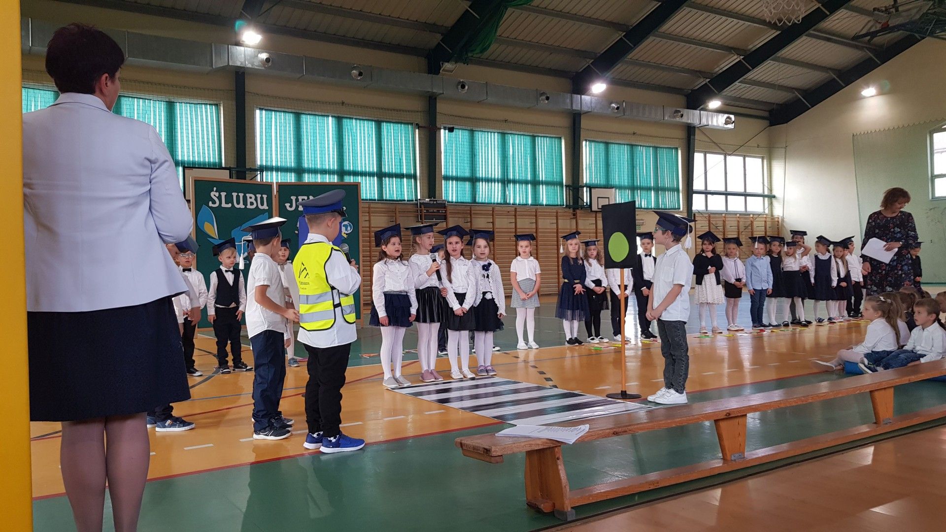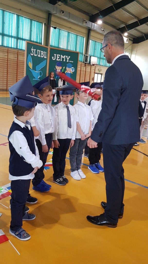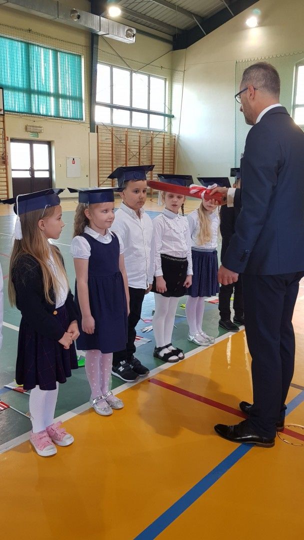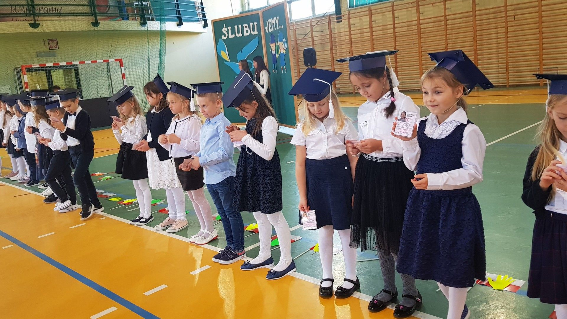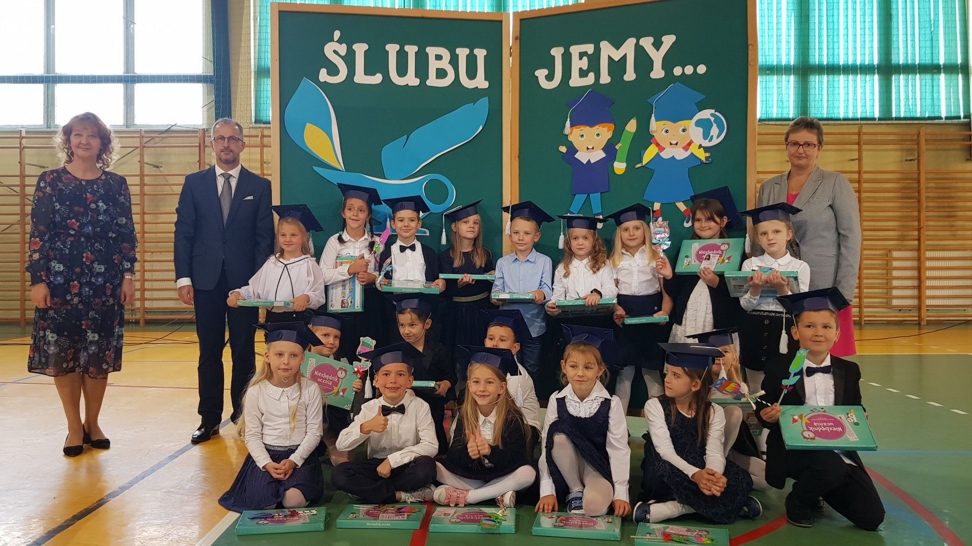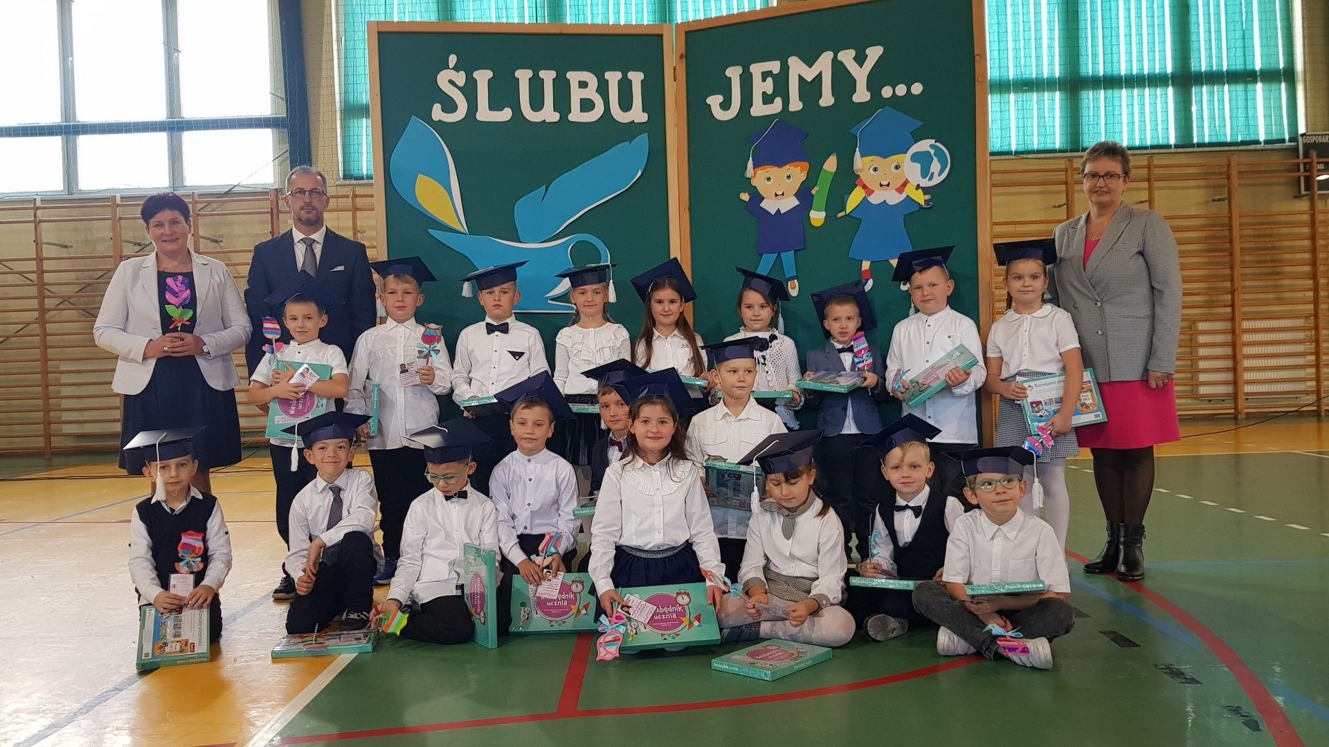 Szczególnym momentem uroczystości było złożenie przez dzieci uroczystego ślubowania oraz pasowanie na uczniów, którego dokonał Dyrektor Szkoły poprzez symboliczne dotknięcie ramienia dziecka - drewnianym ołówkiem. W ten sposób 39 pierwszoklasistów zostało oficjalnie włączonych do społeczności naszej szkoły. Wychowawcy wręczyli "nowym uczniom" legitymacje szkolne. Było wiele ciepłych słów, życzeń skierowanych do pierwszaków oraz upominki od rodziców, przedszkolaków, uczniów klas 3, urzędu gminy. Po uroczystości i pamiątkowych zdjęciach czekał na wszystkich słodki poczęstunek przygotowany przez rodziców.