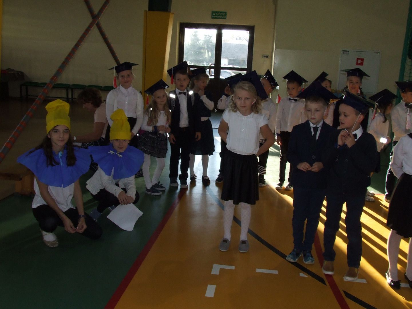Pierwszaki odświętnie ubrani, nieco przejęci, ale z radosnymi minami pięknie zaprezentowały się w przygotowanym przez nich w programie artystycznym. Z wielkim zaangażowaniem recytowały wiersze, śpiewały piosenki i inscenizowały. Wcielając się w rolę edukatorów udzielały wszystkim cennych wskazówek, przypominając „zasady obowiązujące pieszych w ruchu drogowym”. Wyposażeni w odblaski zachęcały zgromadzonych do dbania o swoje bezpieczeństwo. Wypowiedziały wierszem i piosenką piękne słowa o Polsce, akcentując to biało- czerwonym kolorem wstążek, które powiewały w ich rękach przy refrenie piosenki ,,Jesteśmy Polką i Polakiem…”.