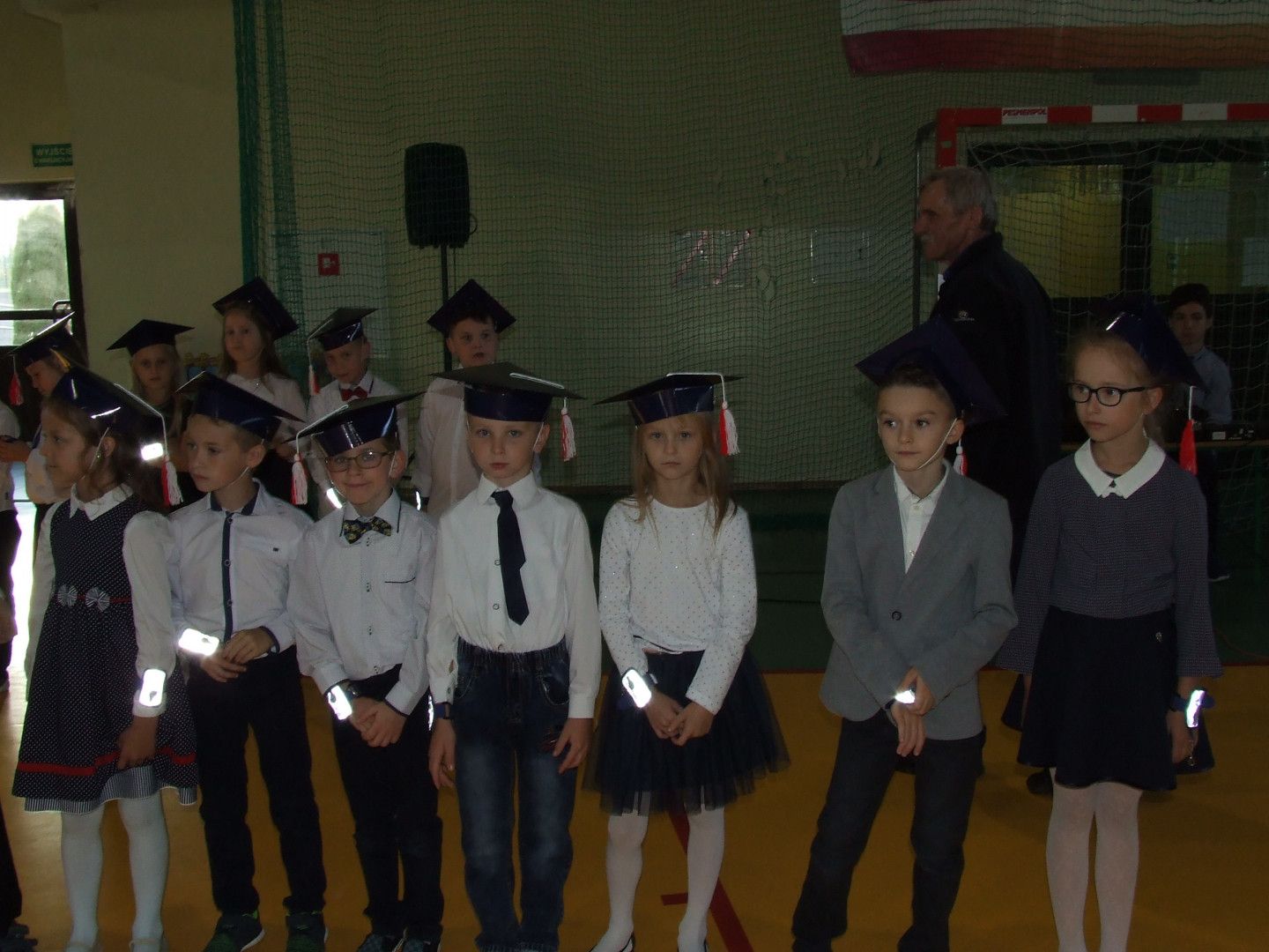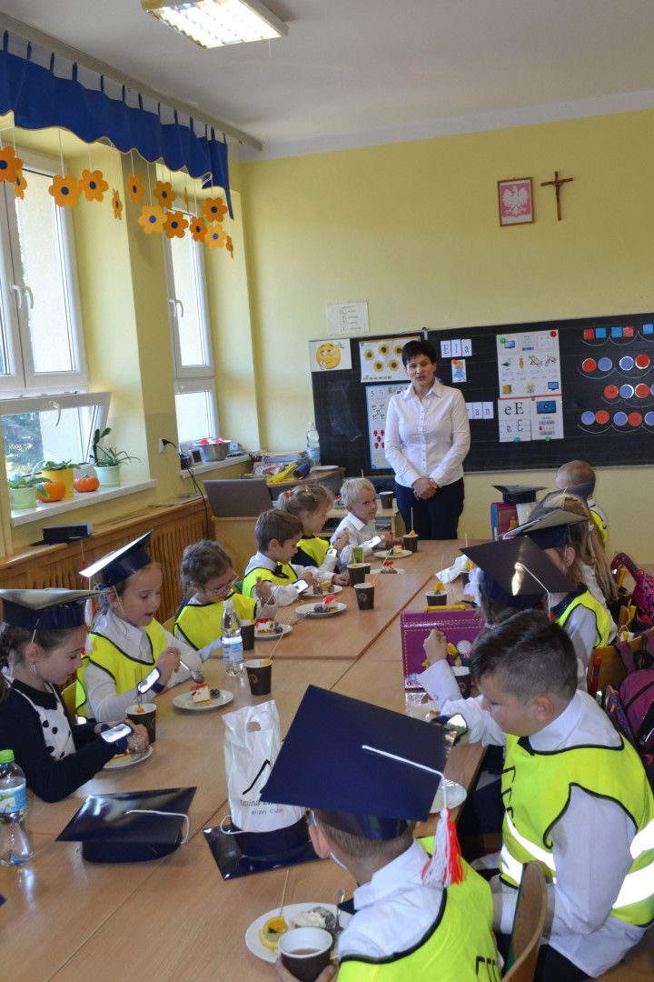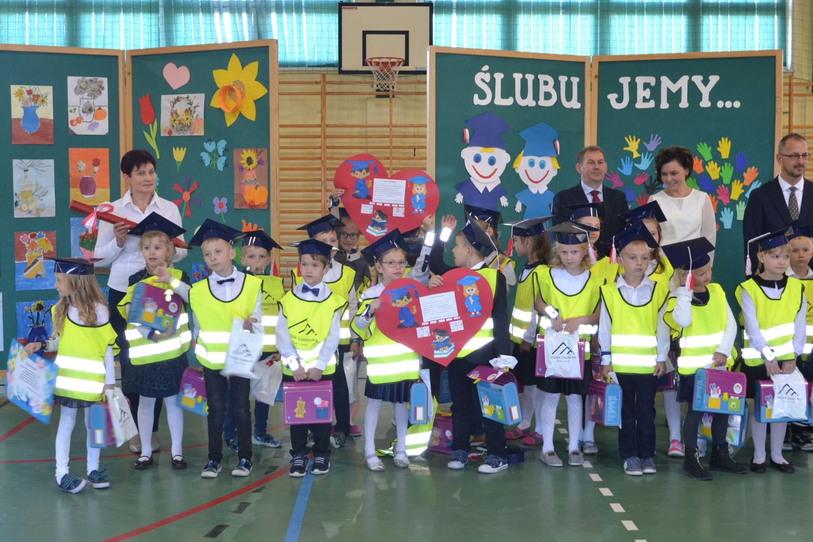Na koniec uroczystości pani Edyta Król oraz pan Marian Mąka wraz z najlepszymi życzeniami wręczyli uczniom klasy pierwszej „kamizelki odblaskowe”, aby każdego dnia świecili przykładem nie tylko wzorowego ucznia, ale również wzorowego uczestnika ruchu drogowego. Po części oficjalnej były wspólne zdjęcia i słodki poczęstunek przygotowany przez Rodziców.