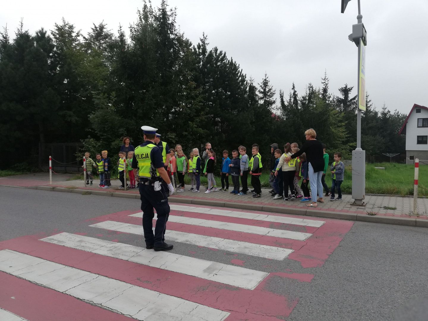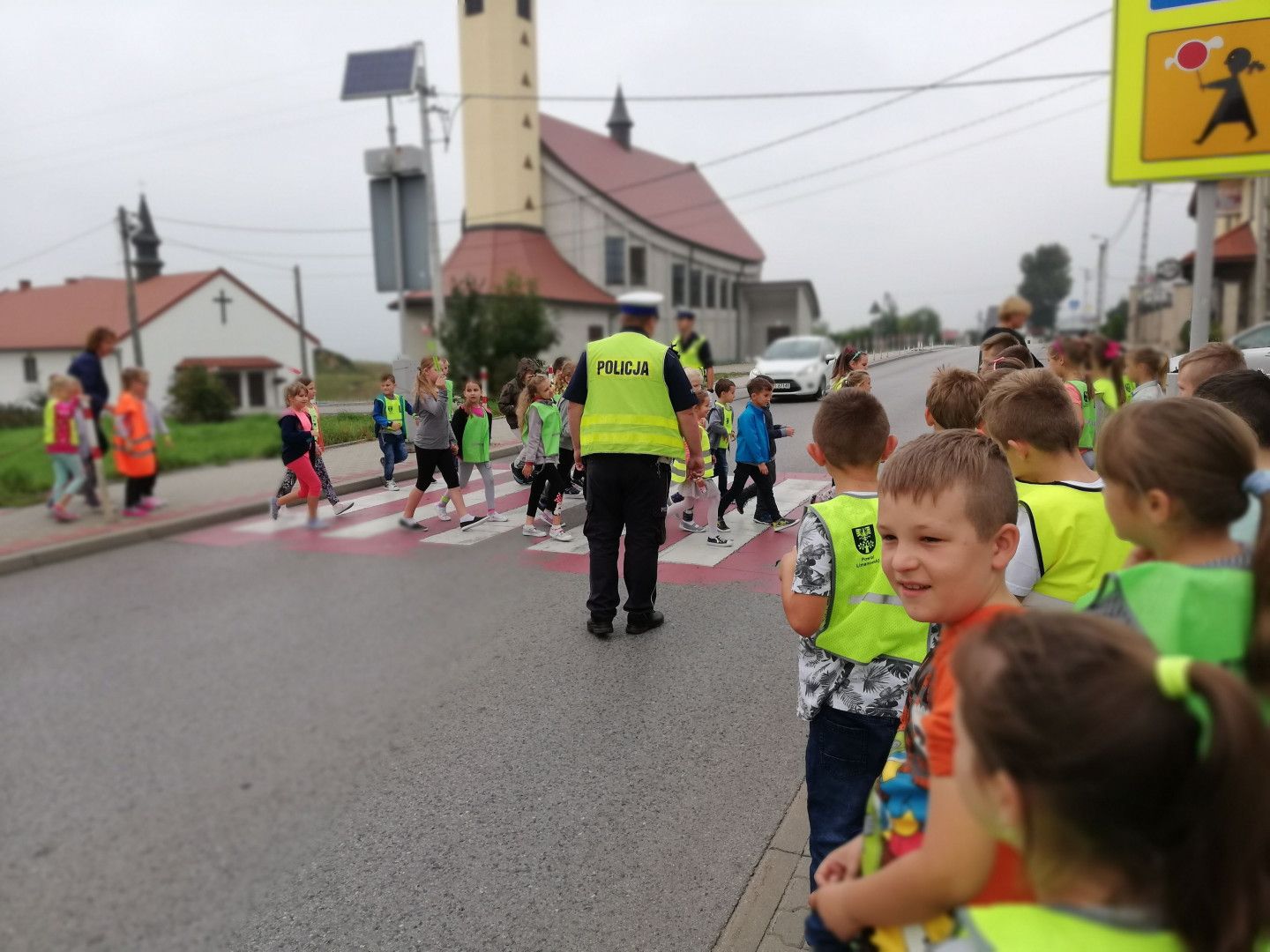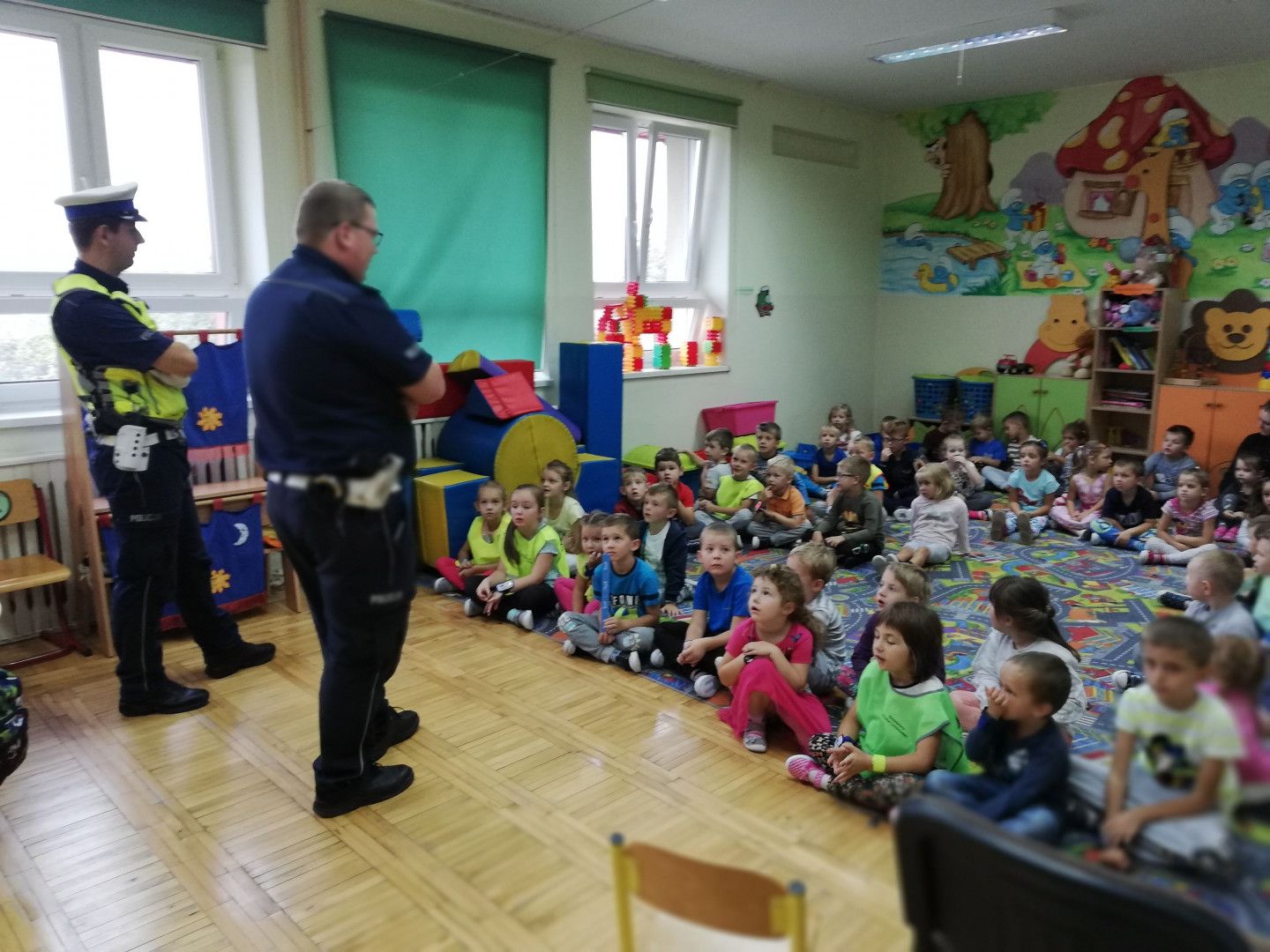 Spotkanie odbyło się 14 września, podczas którego dzieci miały okazję porozmawiać z policjantami o zachowaniu bezpieczeństwa w drodze do szkoły i poza szkołą. Policjanci szczegółowo omówili zasady bezpiecznego poruszania się po drogach podkreślając, jak ważną rolę pełnią elementy odblaskowe, które każdy powinien posiadać. Kilkakrotnie apelowali do uczniów, aby zawsze pamiętali o używaniu kamizelek czy innych elementów odblaskowych podkreślając, że to wpływa na lepszą widzialność, co z kolei zwiększa bezpieczeństwo poruszających się pieszych poboczami dróg, a niejednokrotnie może nawet „ uratować życie”.