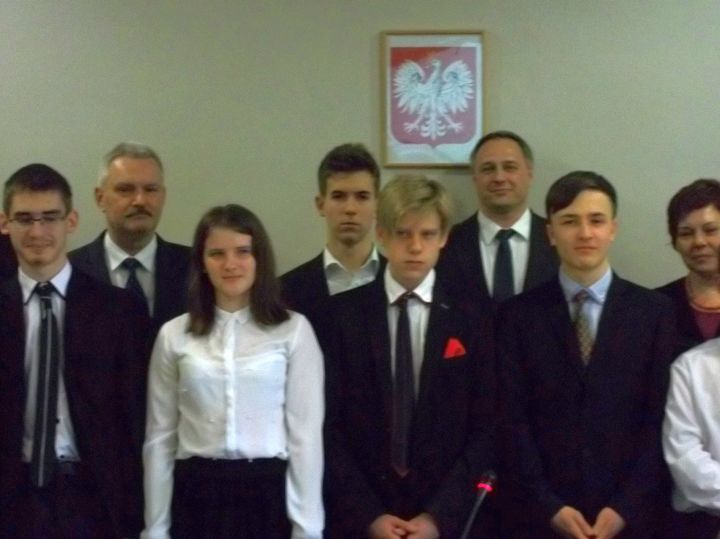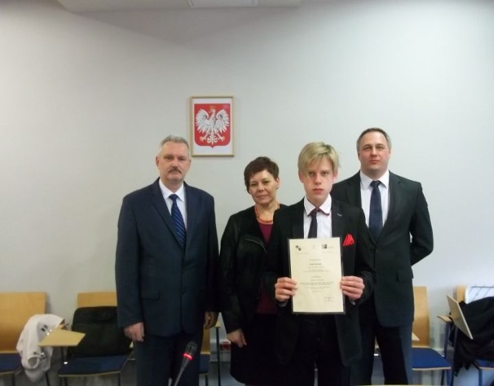 Na zdjęciu drugim: Kamil wśród organizatorów konkursu: Małopolskiego Kuratora Oświaty, Profesora UP w Krakowie, Dyrektora 4 LO w Olkuszu