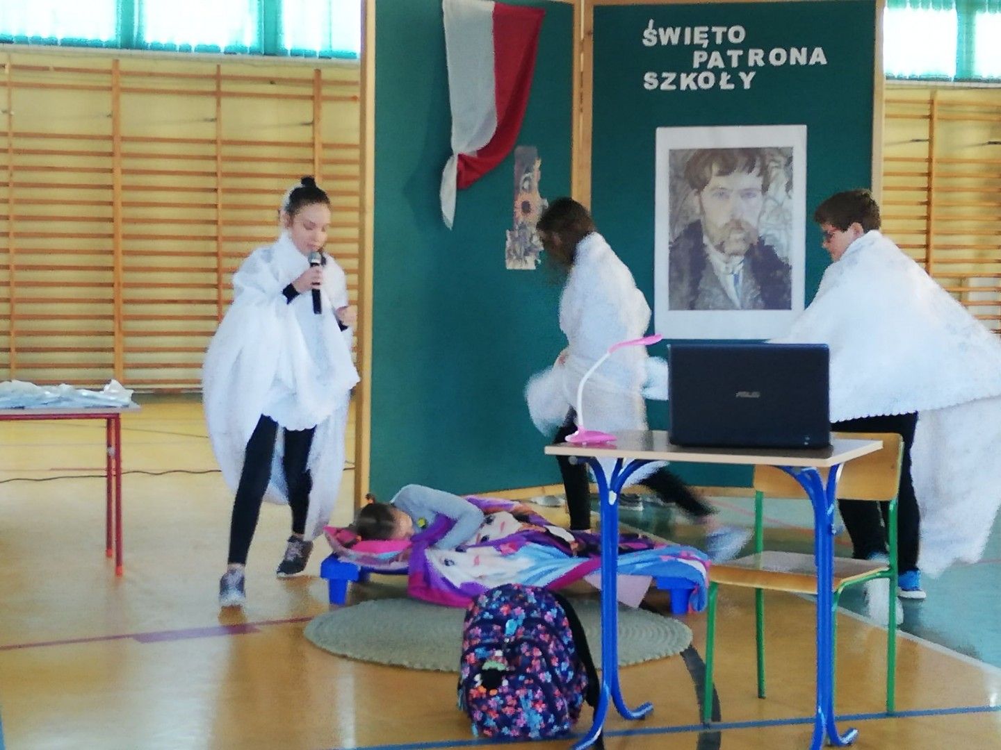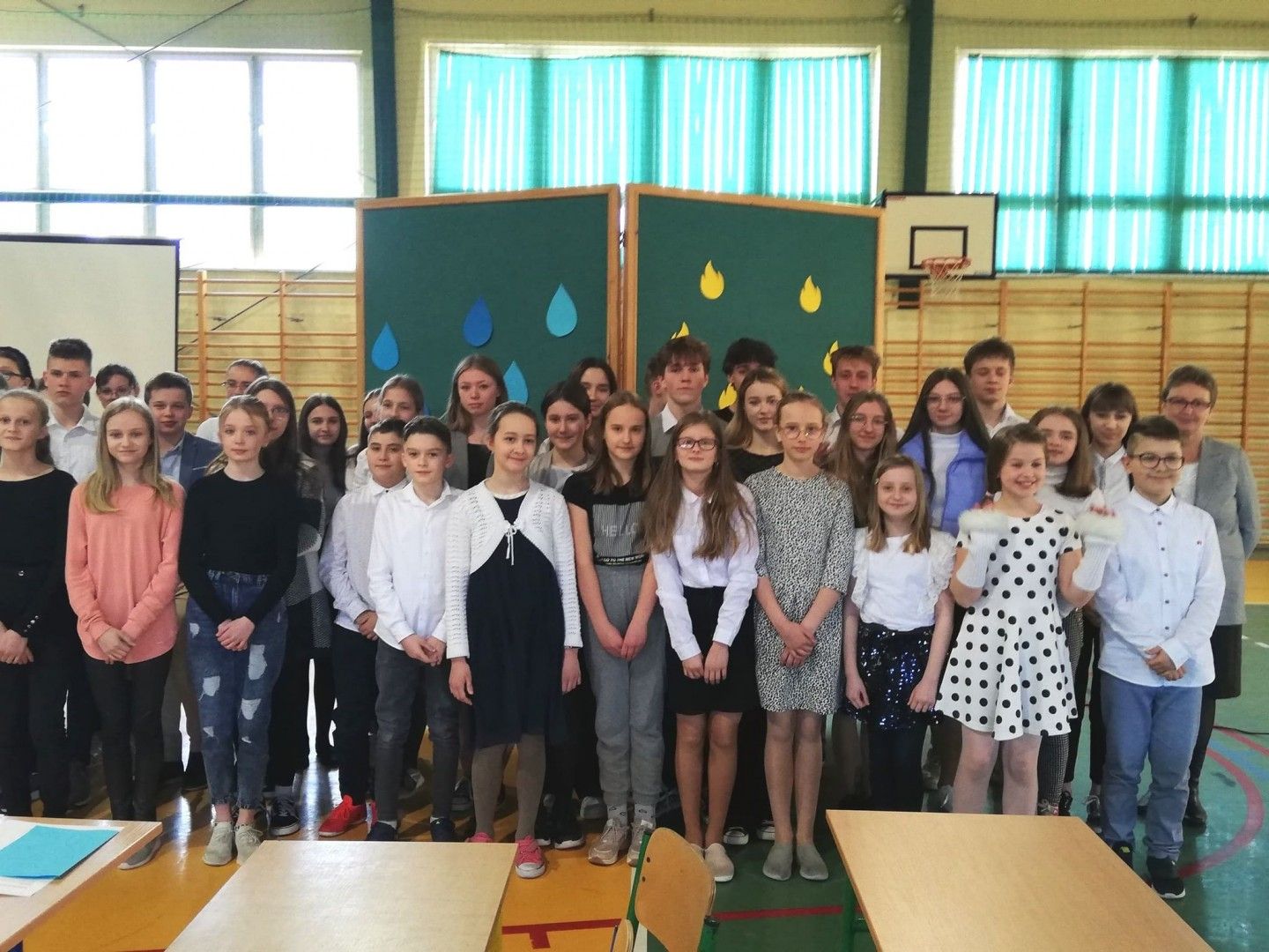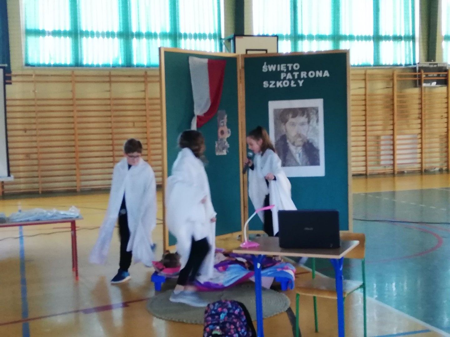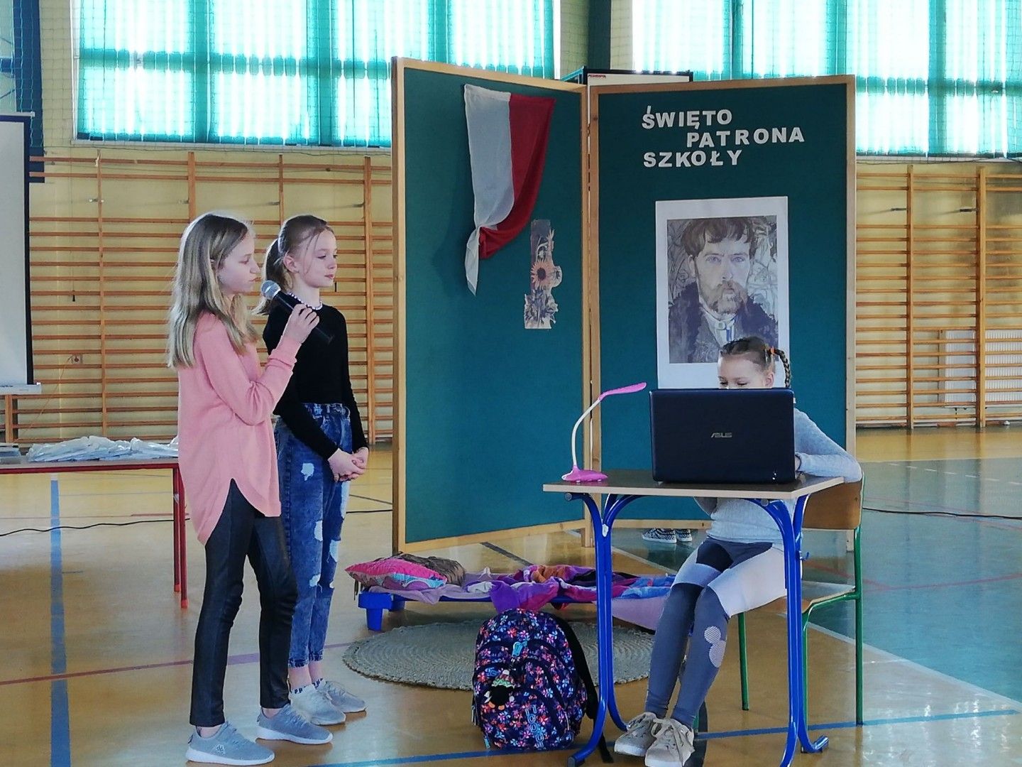 Następnie uczniowie z klas piątych przedstawili krótkie, ale ciekawe inscenizacje na temat bezpieczeństwa w Internecie „Mój przyjaciel – komputer” oraz „Zgoda buduje, niezgoda rujnuje”. Później nastąpiło wręczenie nagród laureatom konkursów, które odbyły się z wykorzystaniem platformy quizizz. Zwycięzcy konkursu frazeologicznego „Z frazeologią za pan brat”: Szymon Smoroński, Zofia Hada, Julia Szubryt, Kinga Tomasik. Zwycięzcy konkursu wiedzy o patronie naszej szkoły „Życie i twórczość Stanisława Wyspiańskiego”: Szymon Smoroński, Joanna Twaróg, Zofia Mąka. Na koniec pan dyrektor udzielił uczniom z poszczególnych klas pochwał i nagród statutowych na forum szkoły.