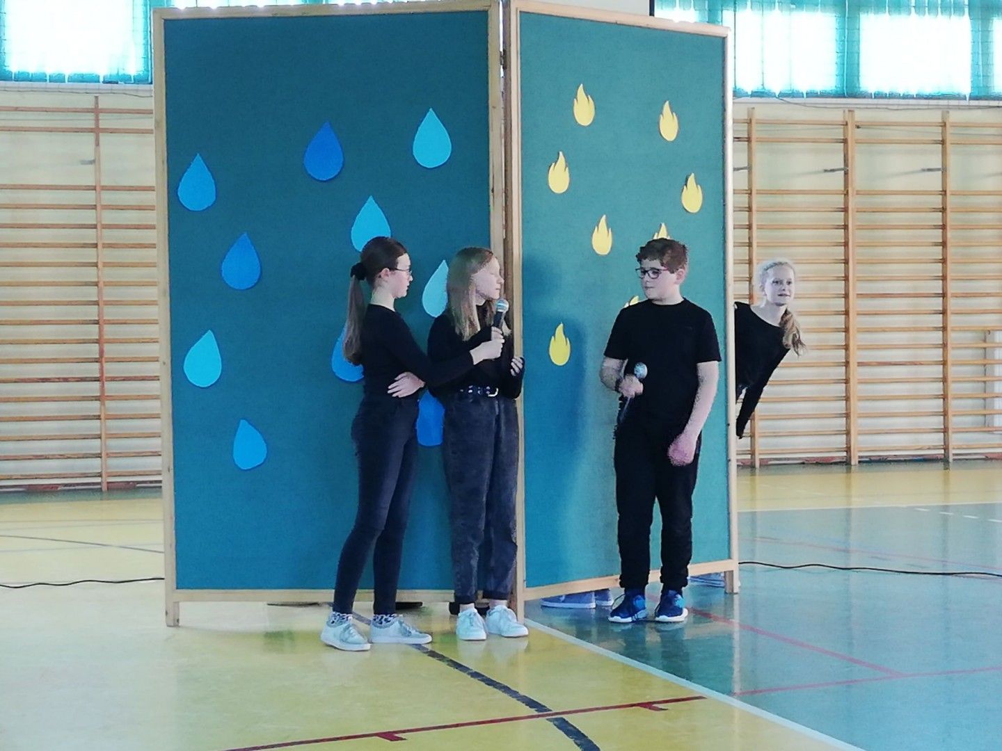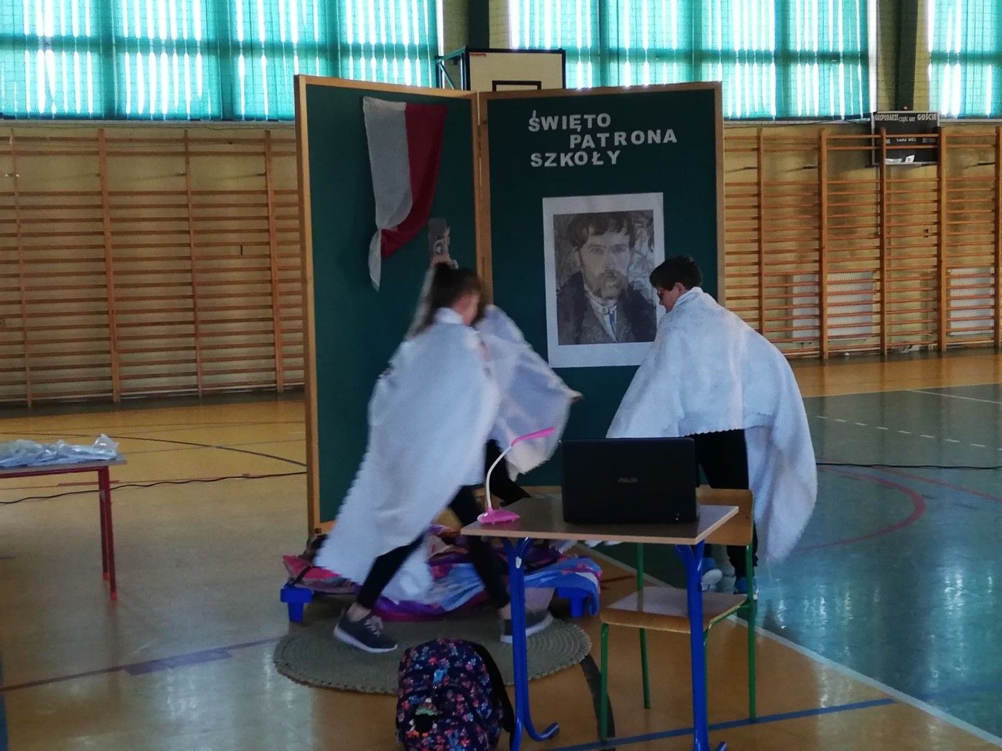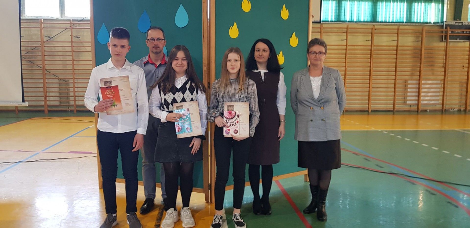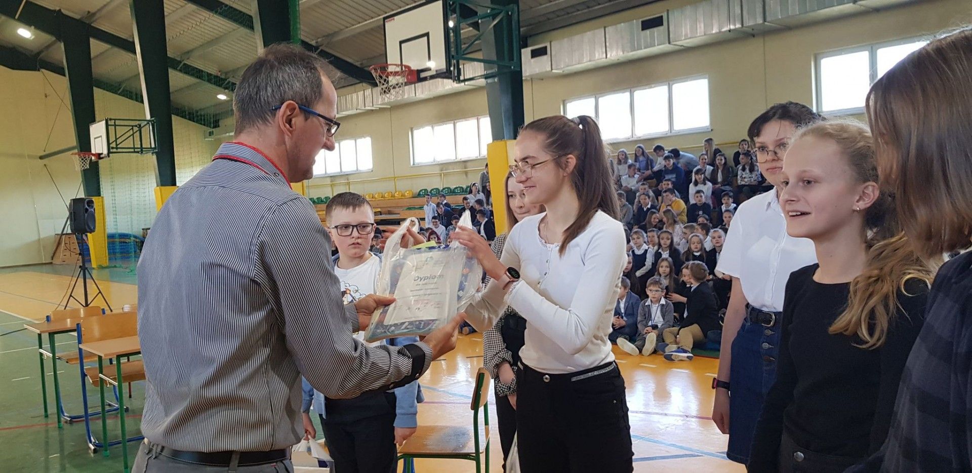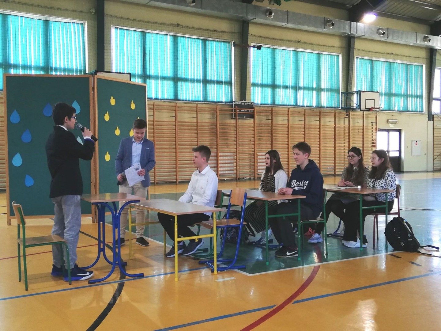 Następnie uczniowie z klas piątych przedstawili krótkie, ale ciekawe inscenizacje na temat bezpieczeństwa w Internecie „Mój przyjaciel – komputer” oraz „Zgoda buduje, niezgoda rujnuje”. Później nastąpiło wręczenie nagród laureatom konkursów, które odbyły się z wykorzystaniem platformy quizizz. Zwycięzcy konkursu frazeologicznego „Z frazeologią za pan brat”: Szymon Smoroński, Zofia Hada, Julia Szubryt, Kinga Tomasik. Zwycięzcy konkursu wiedzy o patronie naszej szkoły „Życie i twórczość Stanisława Wyspiańskiego”: Szymon Smoroński, Joanna Twaróg, Zofia Mąka. Na koniec pan dyrektor udzielił uczniom z poszczególnych klas pochwał i nagród statutowych na forum szkoły.