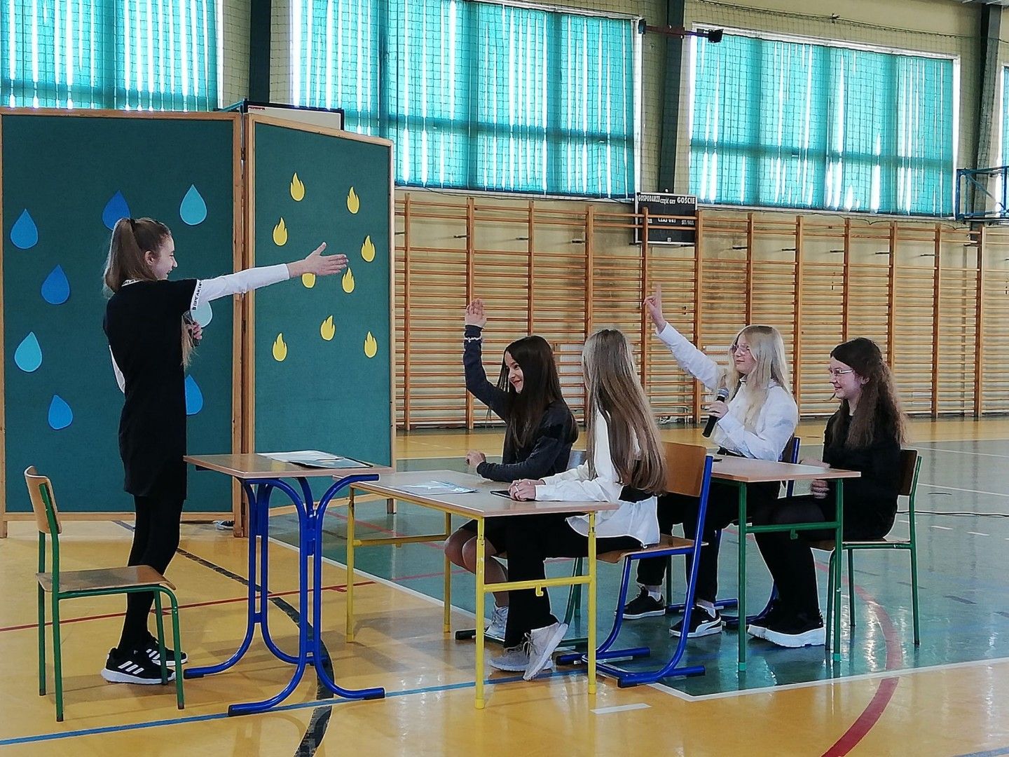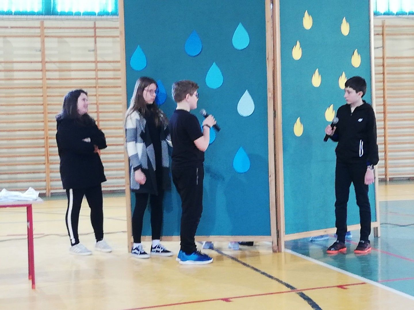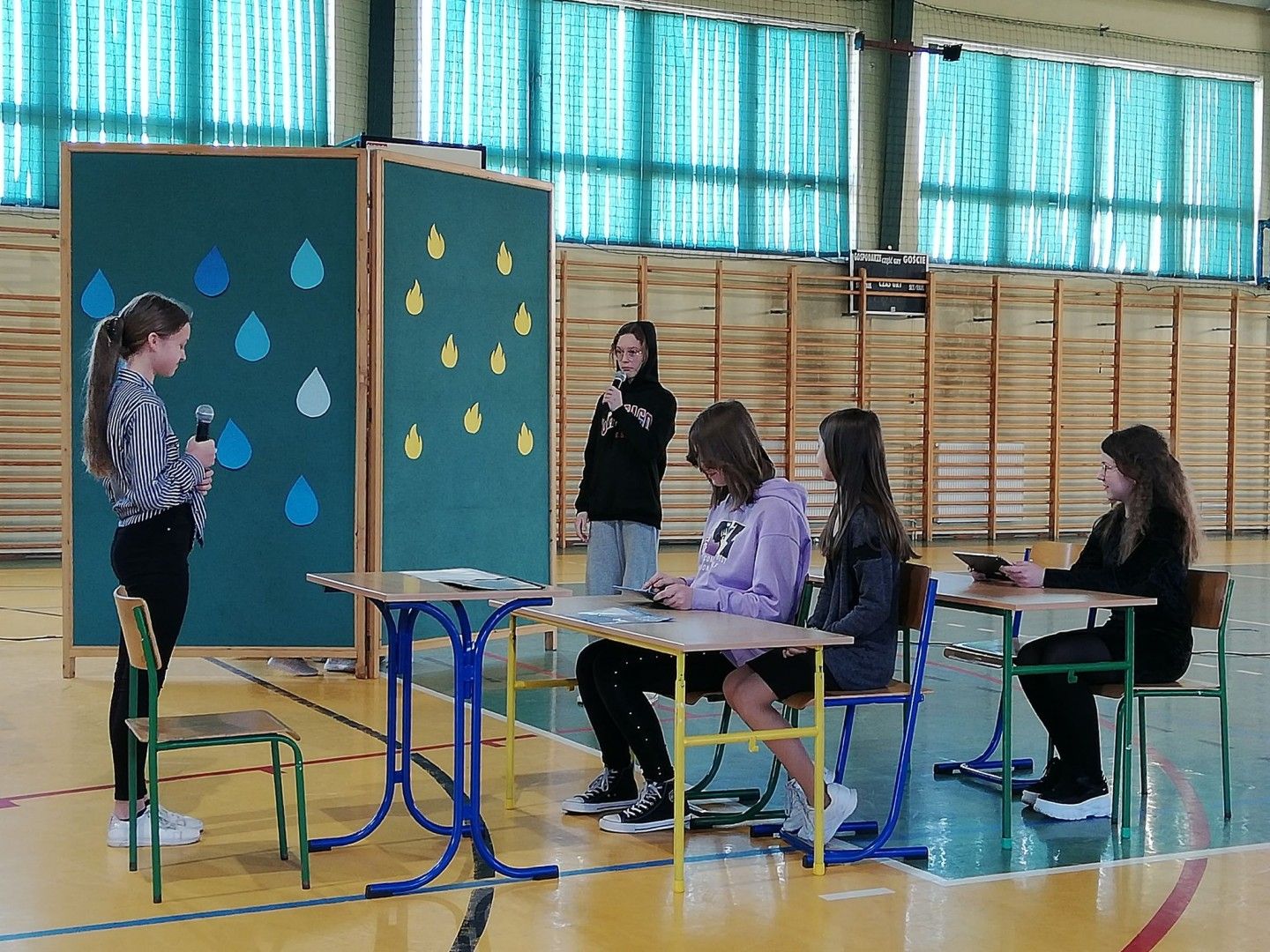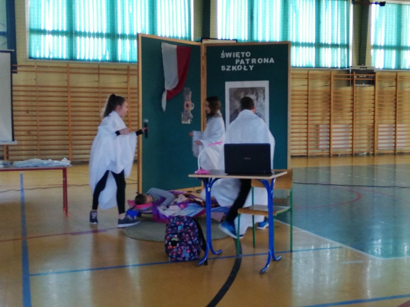 Następnie uczniowie z klas piątych przedstawili krótkie, ale ciekawe inscenizacje na temat bezpieczeństwa w Internecie „Mój przyjaciel – komputer” oraz „Zgoda buduje, niezgoda rujnuje”. Później nastąpiło wręczenie nagród laureatom konkursów, które odbyły się z wykorzystaniem platformy quizizz. Zwycięzcy konkursu frazeologicznego „Z frazeologią za pan brat”: Szymon Smoroński, Zofia Hada, Julia Szubryt, Kinga Tomasik. Zwycięzcy konkursu wiedzy o patronie naszej szkoły „Życie i twórczość Stanisława Wyspiańskiego”: Szymon Smoroński, Joanna Twaróg, Zofia Mąka. Na koniec pan dyrektor udzielił uczniom z poszczególnych klas pochwał i nagród statutowych na forum szkoły.