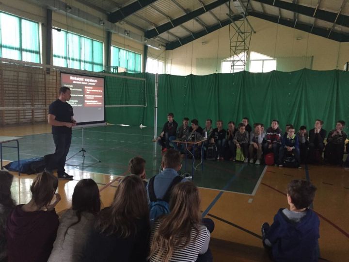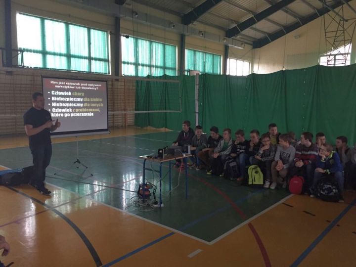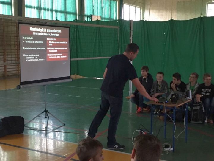 Pierwsza część spotkania poświęcona była omówieniu zagrażającym zdrowiu i życiu człowieka substancjom odurzającym tj. dopalacze, narkotyki i alkohol. Prowadzący, wzmacniając przekaz wyświetlanymi slajdami, mówił o procesie uzależnienia od ww. substancji i nieodwracalnych skutkach sięgania po nie. Został również odtworzony film przestrzegający przed lekkomyślną jazdą samochodem pod wpływem alkoholu.