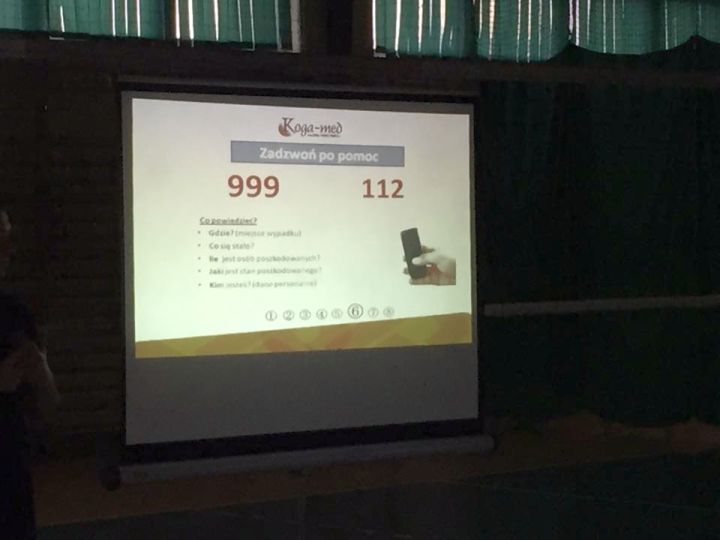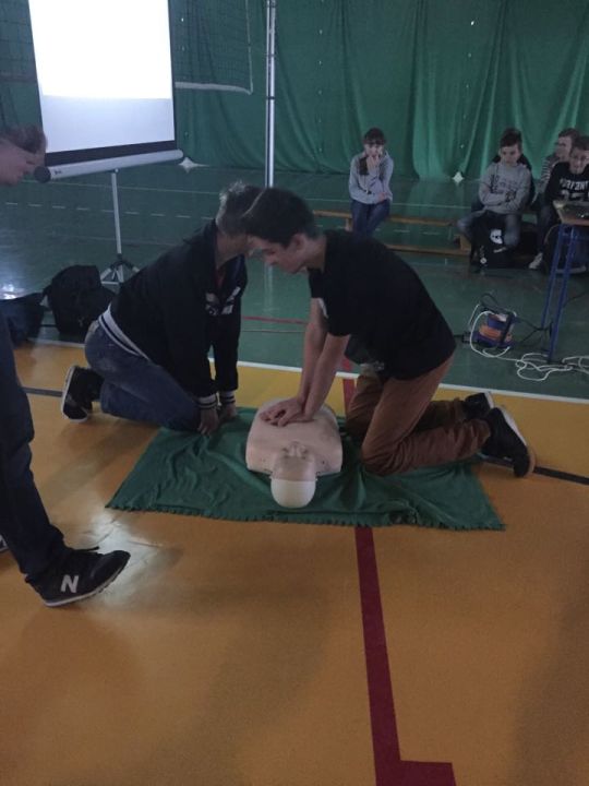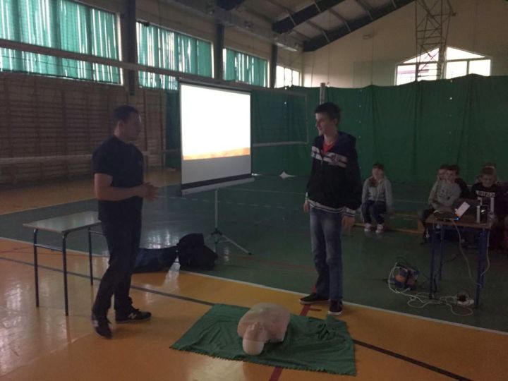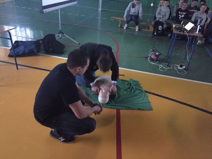 W drugiej części, sala gimnastyczna szkoły, gdzie realizowano program, zamieniła się w miejsce przyspieszonego kursu z zakresu pierwszej pomocy przedmedycznej. Po krótkim instruktażu, chętni uczniowie krok po kroku ćwiczyli na fantomie masaż serca. Udzielając pozytywnej informacji zwrotnej o przeprowadzonej próbie reanimacji, prowadzący zachęcał do podejmowania działań ratujących ludzie życie. Podkreślał przy tym konieczność zadbania o własne bezpieczeństwo.