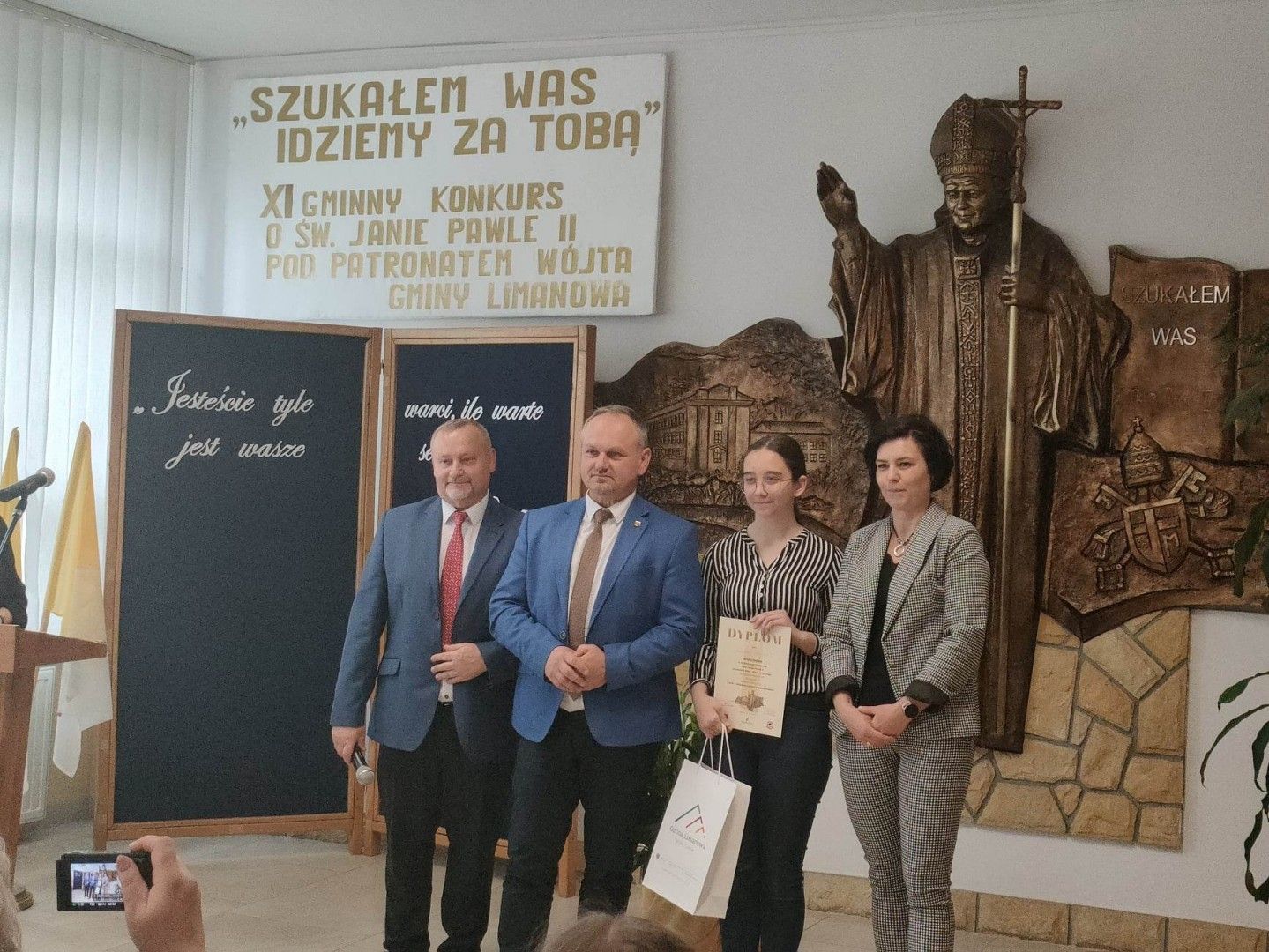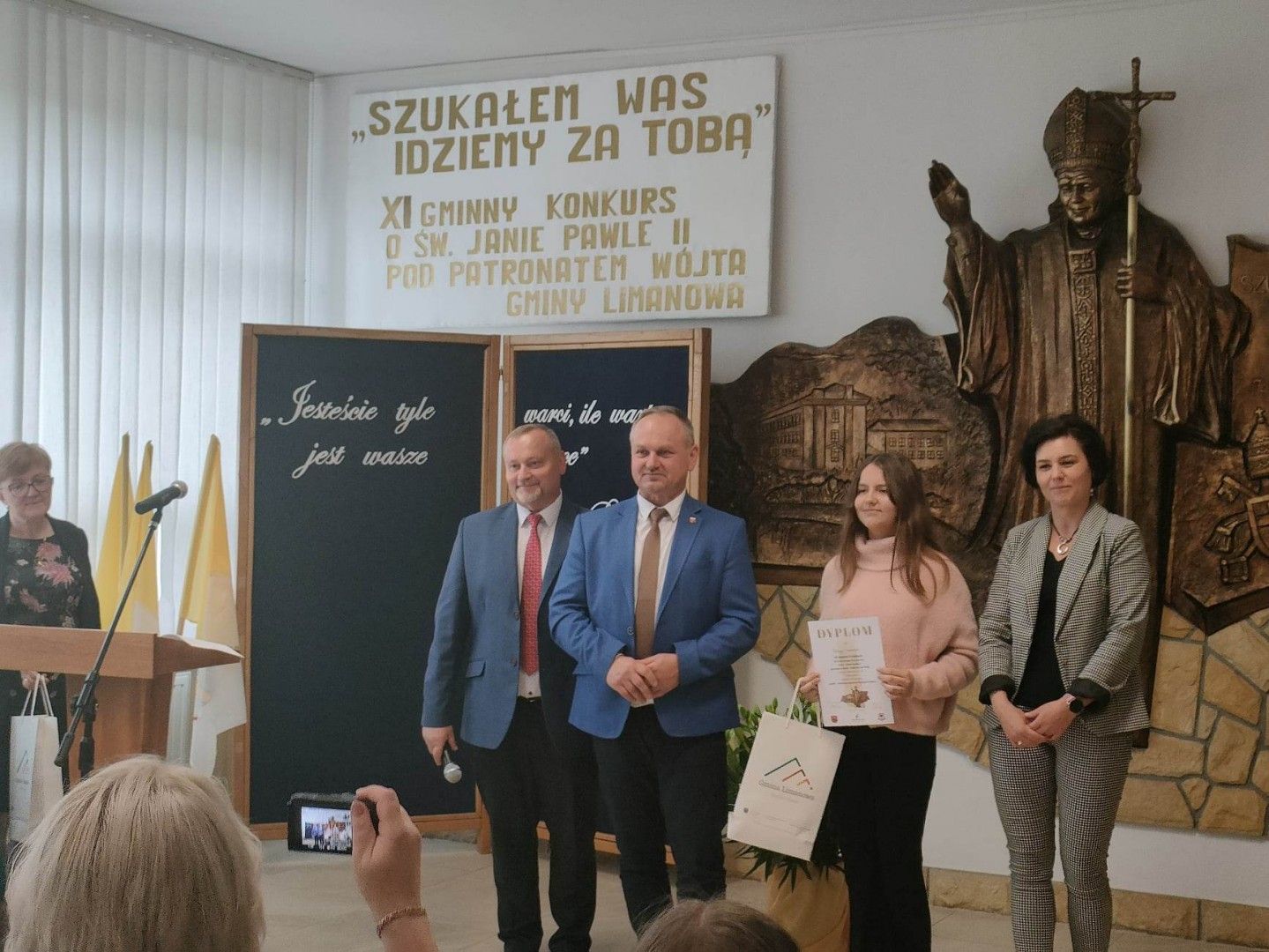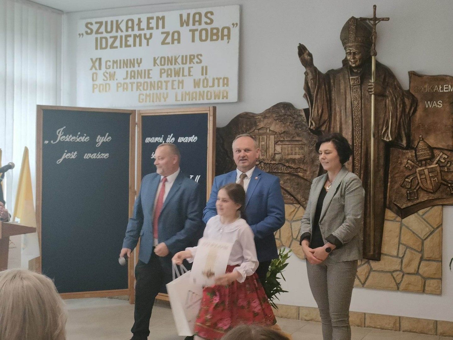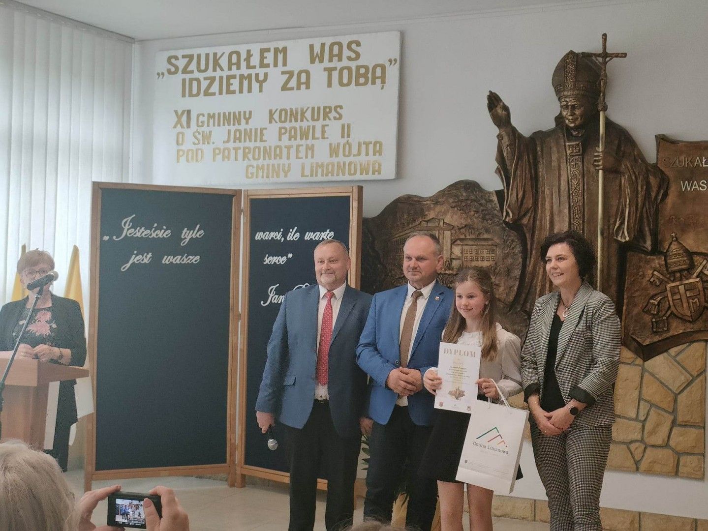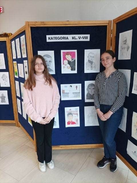 W konkursie wokalnym piosenki o Janie Pawle II w kategorii 1-4 przyznano II miejsce Kalinie Wojtas (kl.4b) a w kategorii 5-8 II miejsce zajęła Emilia Kaim (kl.5b). W konkursie plastycznym „Lolek –dziecięcy portret Papieża” w kategorii klas 5-8 II miejsce przyznano Patrycji Sukiennik (kl.6a) i wyróżnienie dla Małgorzaty Tokarczyk (kl. 8). Konkurs miał na celu uczczenie pamięci Ojca Świętego, popularyzację utworów muzycznych poświęconych Janowi Pawłowi II, zapoznanie z biografią, twórczością i nauczaniem Papieża Polaka. Budujące jest to, że dzieci i młodzież chętnie bierze udział w konkursach upamiętniających naszego papieża. Serdecznie gratulujemy naszym uczniom pięknych występów i sukcesów!