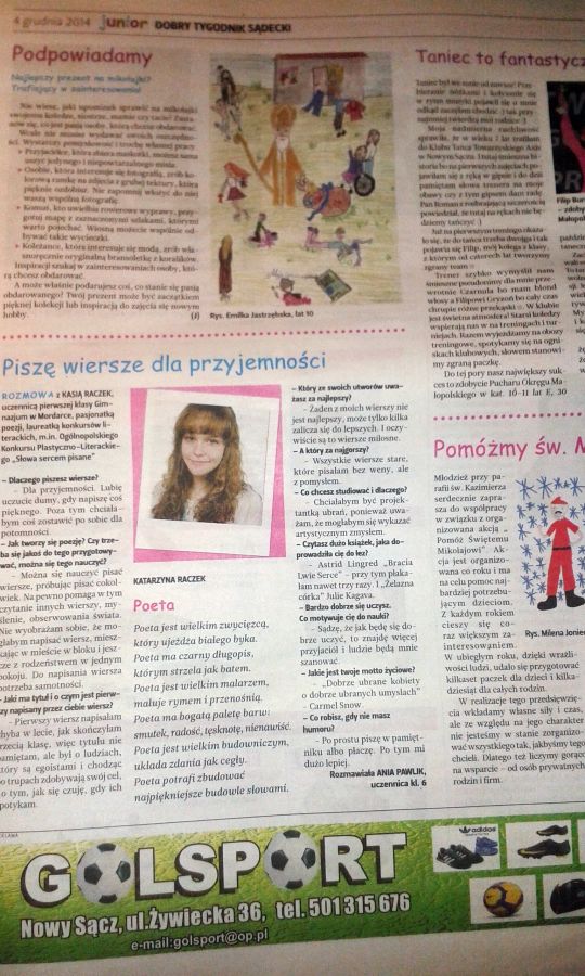 „Piszę wiersze dla przyjemności” – wywiad Anny Pawlik z kl.I Gim. z Kasią Raczek