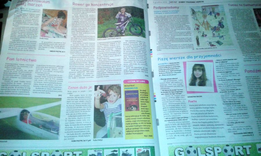 Uczniowie naszej szkoły po raz kolejny opublikowali swoje artykuły w specjalnej, comiesięcznej wkładce dla młodych czytelników – „Junior” w Dobrym Tygodniku Sądeckim. W I semestrze roku szkolnego 2014/2015 na łamach trzech numerów gazety (nr 38 (203) z 24 września 2014 r., nr 47 (211) z 27 listopada 2014 r., nr 48 (212) z 4 grudnia 2014 r.) znalazły się teksty: