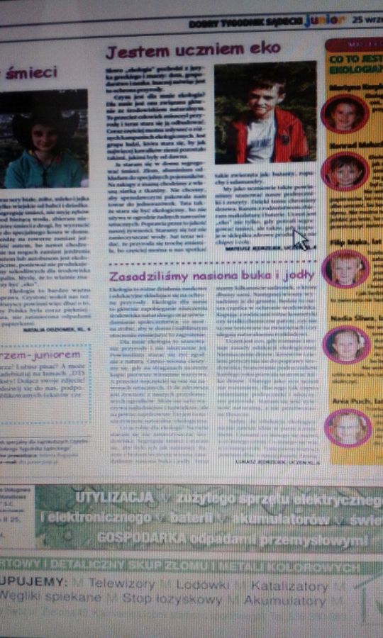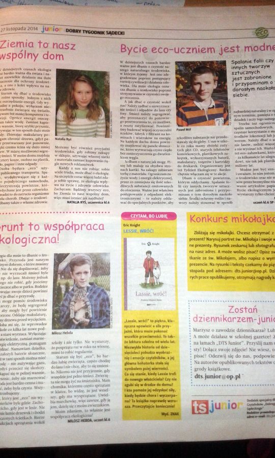 Uczniowie naszej szkoły po raz kolejny opublikowali swoje artykuły w specjalnej, comiesięcznej wkładce dla młodych czytelników – „Junior” w Dobrym Tygodniku Sądeckim. W I semestrze roku szkolnego 2014/2015 na łamach trzech numerów gazety (nr 38 (203) z 24 września 2014 r., nr 47 (211) z 27 listopada 2014 r., nr 48 (212) z 4 grudnia 2014 r.) znalazły się teksty: „W domu segregujemy śmieci” Natalii Odziomek z kl.6, „Jestem uczniem eko” Mateusza Jędrzejka z kl.4a,...