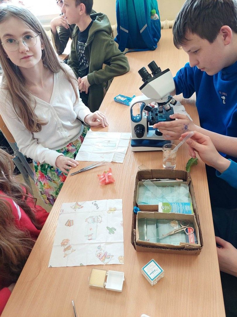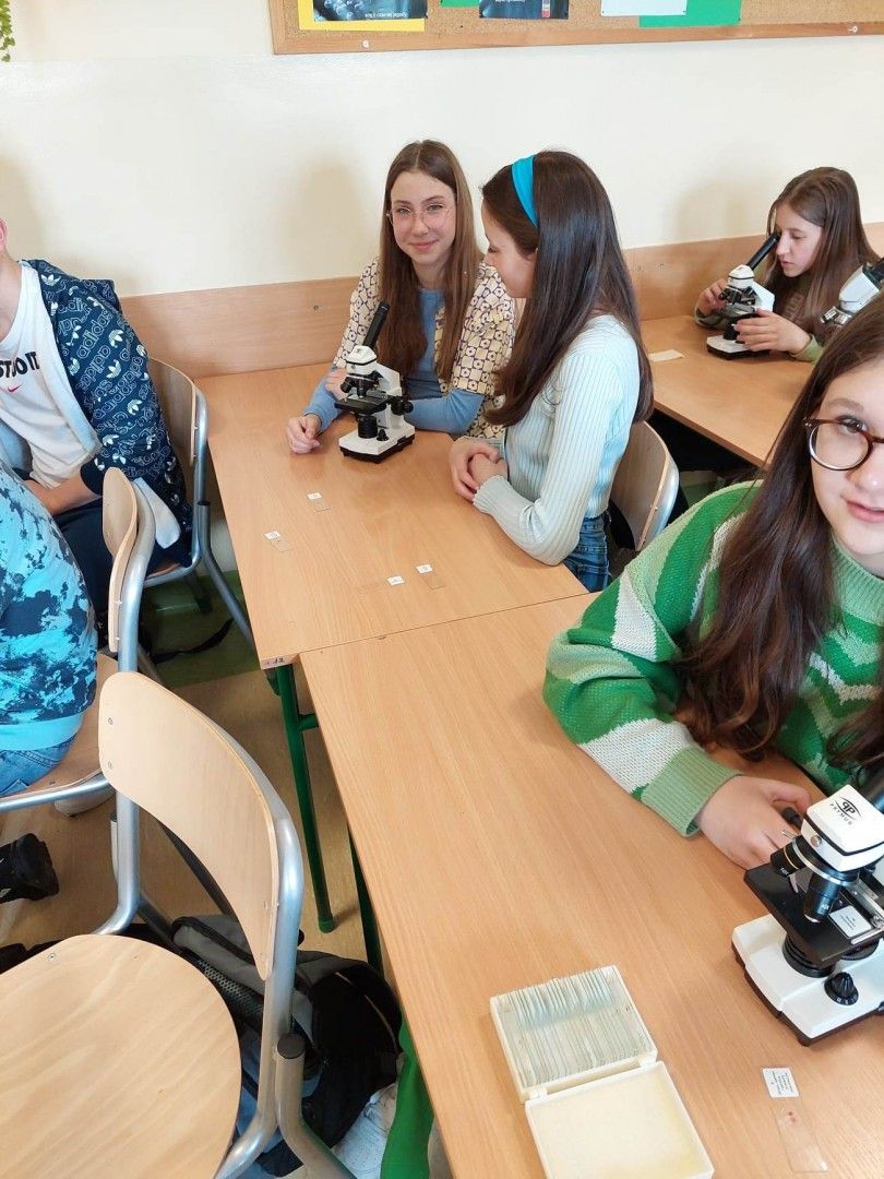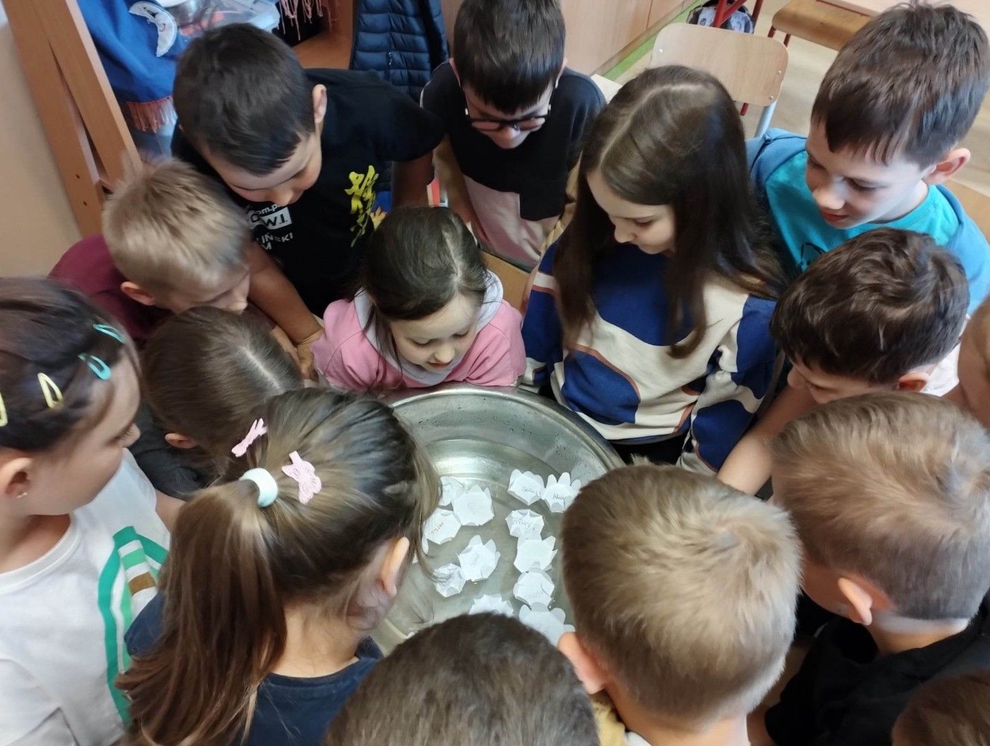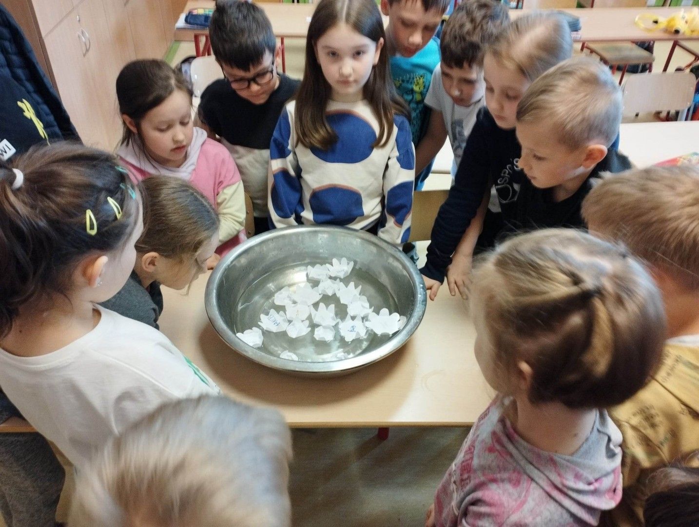 Dzieci z klasy 1a wykonały eksperymenty: „tęcza na talerzu”, „uciekający pieprz”- czyli jak mydło przegania zarazki, „balonowy szaszłyk” – czyli wykałaczka w balonie, dmuchanie balonu za pomocą sody i octu, badali gęstość wody, wykorzystując do tego jajko. Klasa 1b wykonała eksperyment „rozkwitające kwiaty”. Uczniowie klasy 0c, 1b, 2a zapoznali się również z budową mikroskopu. Dzieci dowiedziały się co jest potrzebne, aby zrobić preparat mikroskopowy oraz obserwowały pod mikroskopem łodygę fasoli.