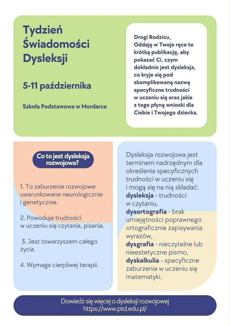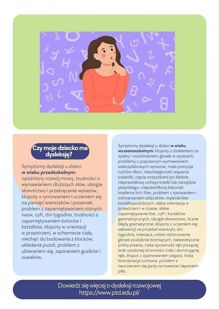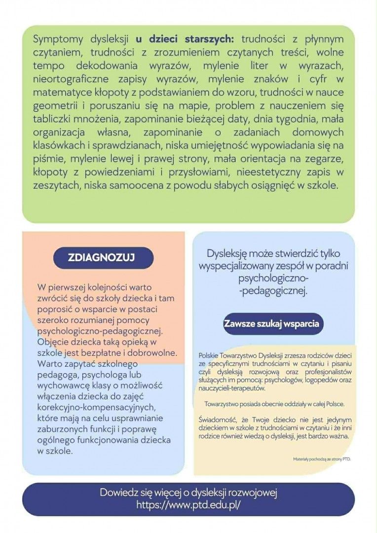 5. Ulotka informacyjna dla rodziców pod tytułem Jestem rodzicem dziecka z dysleksją - to krótka publikacja, która pokazuje, czym dokładnie jest dysleksja rozwojowa i co kryje się pod skomplikowaną nazwą specyficzne trudności w uczeniu się.