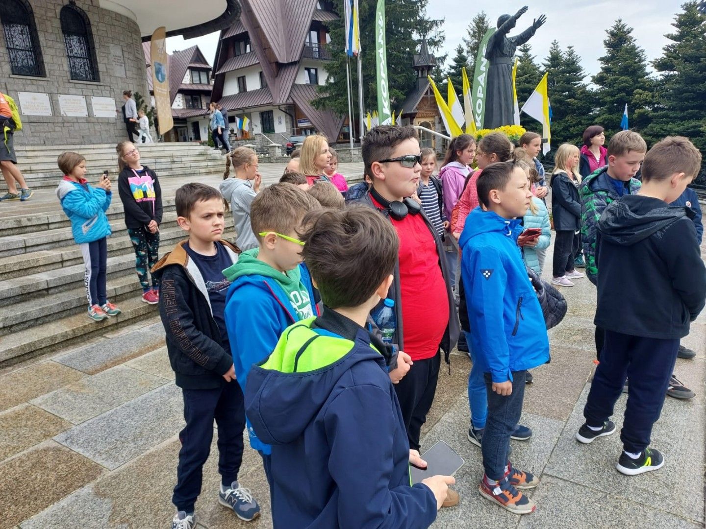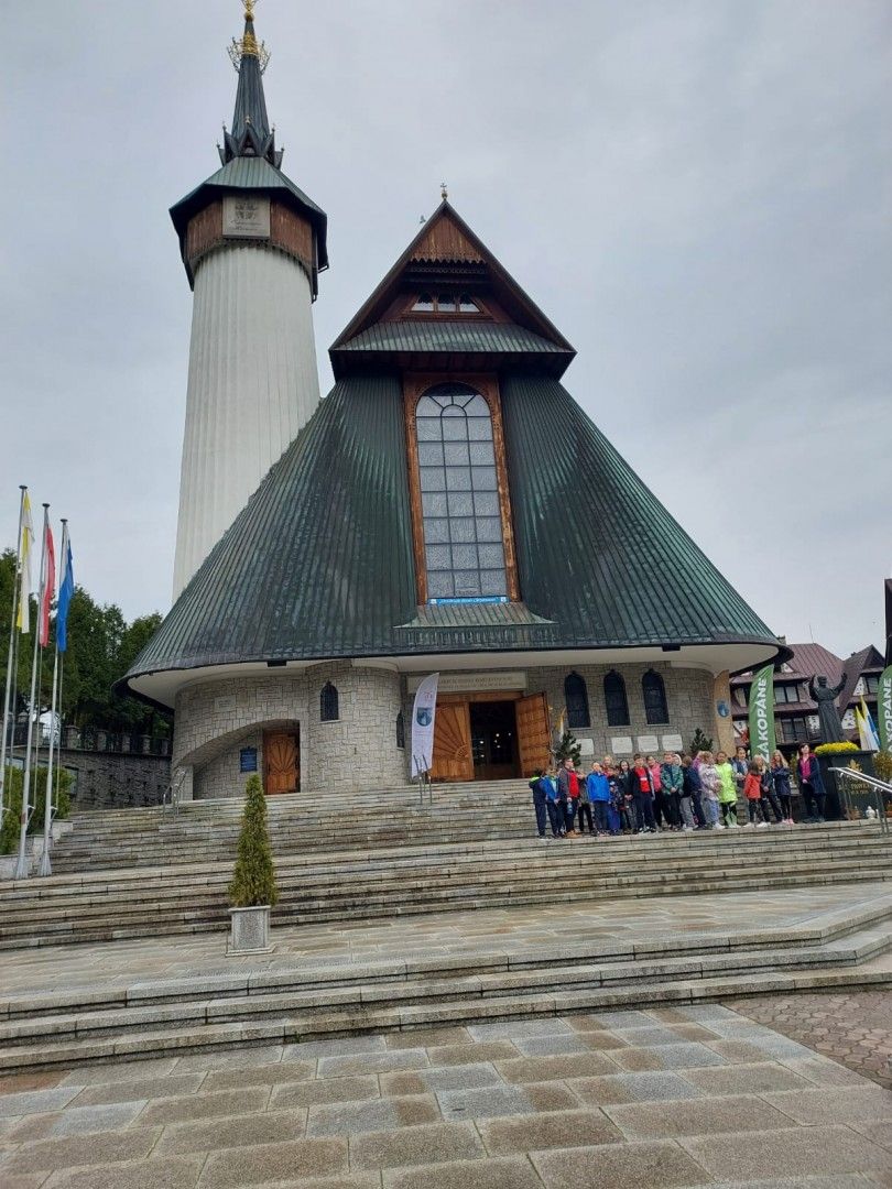Pierwszym punktem naszej wycieczki było Sanktuarium Narodowe Matki Bożej Fatimskiej na Krzeptówkach w Zakopanem. Uczniowie dowiedzieli się, że kościół stanowi wotum dziękczynne za ocalenie życia Ojca Świętego Jana Pawła II w dniu 13 maja 1981 roku. Po chwili wyciszenia i zadumy ruszyliśmy dalej. Pogoda nas nie rozpieszczała, więc skocznię narciarską Wielką Krokiew zobaczyliśmy przez szyby autokaru.