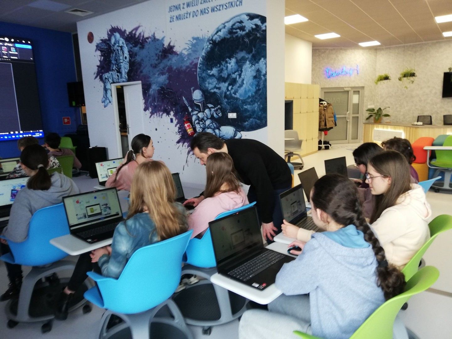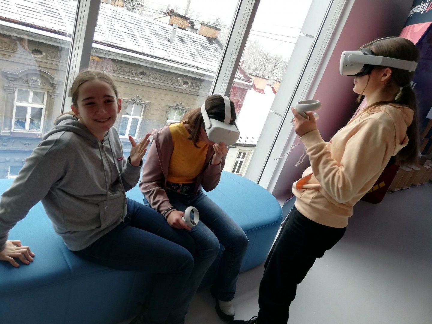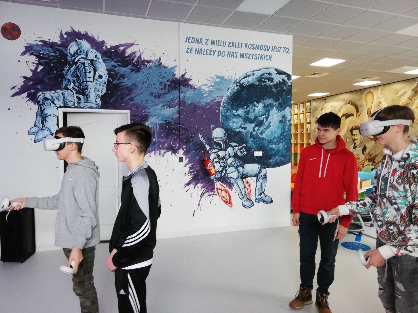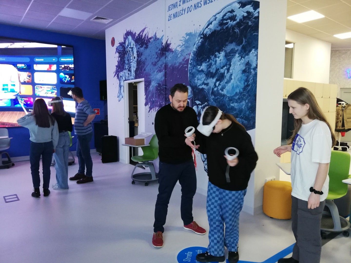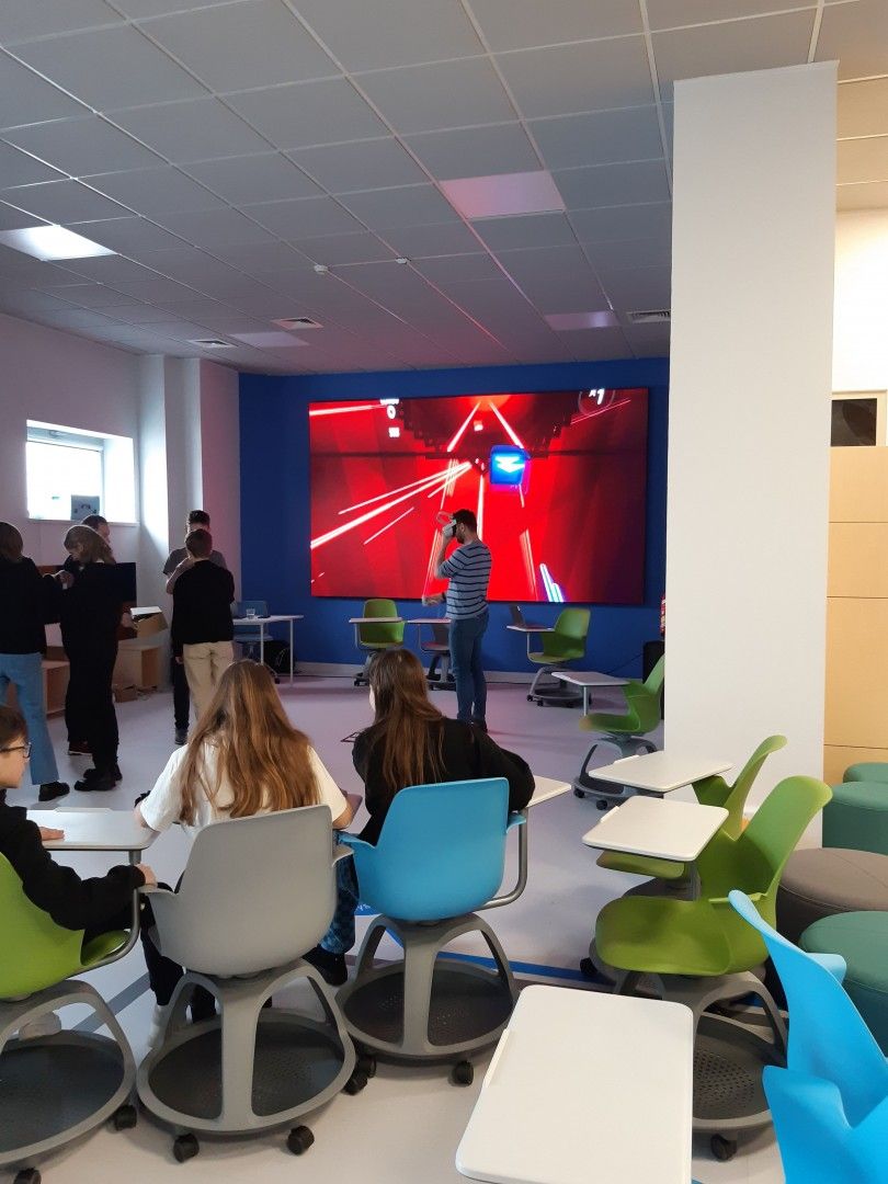 Uczniowie w nowoczesnej pracowni korzystali z kilku stref - ze strefy programowania i kodowania oraz strefy obrazu i dźwięku. Uczestnicy wycieczki rozwiązywali zadania w wirtualnym pokoju zagadek dzięki aplikacji Genially, grali w grę terenową w aplikacji Actionbound, a także tworzyli swoją własną grę o najbliższej okolicy. Uczniowie projektowali ilustracje w programie graficznym, a także występowali przed kamerą, recytowali, śpiewali. Dużej radości i świetnej rozrywki dostarczyły okulary VR, które zanurzyły uczniów w wirtualną rzeczywistość. Dla jednych atrakcją był roller coaster, a dla innych walka bokserska, spotkanie z dinozaurami czy spacer po kanionie. Emocji podczas tej aktywności nie brakowało.