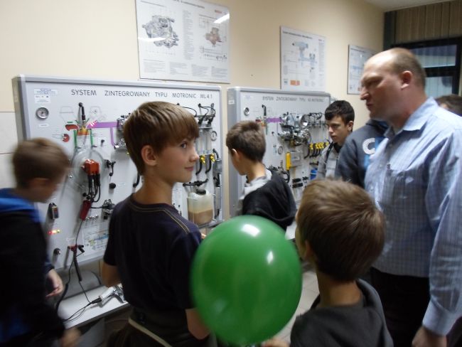 Chłopcom szczególnie podobało się w Laboratorium Mechatroniki Pojazdów Samochodowych, gdzie mogli obejrzeć i dotknąć zestawy demonstrujące silniki, skrzynię przekładniową, układ kierowniczy ze wspomaganiem elektrohydraulicznym i elektrycznym samochodu.