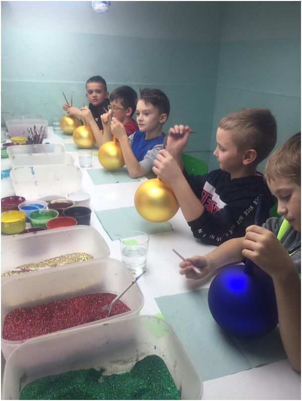 Ze skupieniem i starannością wzięły się do pracy, a wykonane przez nich wzory były bardzo pomysłowe, oryginalne i piękne. Ozdobione bombki zostały wysuszone i zapakowane do pudełek, które dzieci zabrały do domu. W drodze powrotnej wszyscy świetnie bawili się w parku rozrywki.
