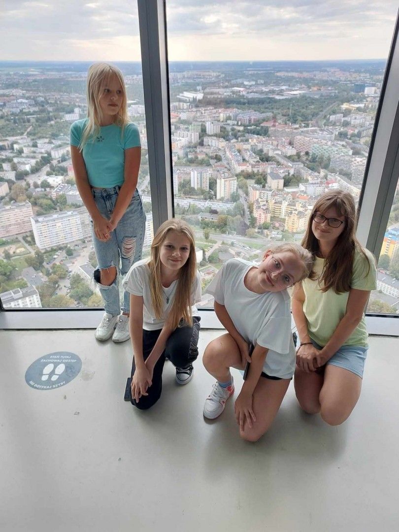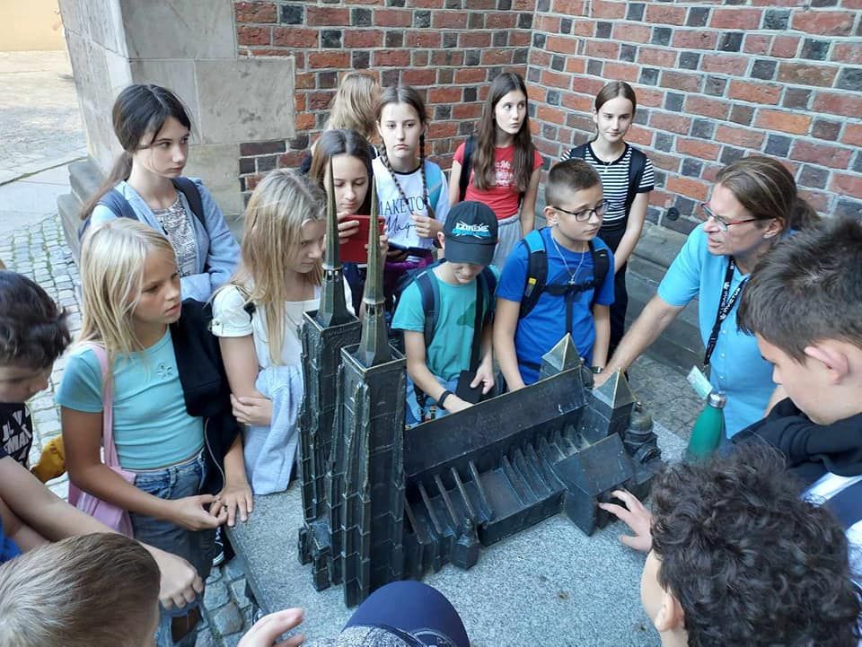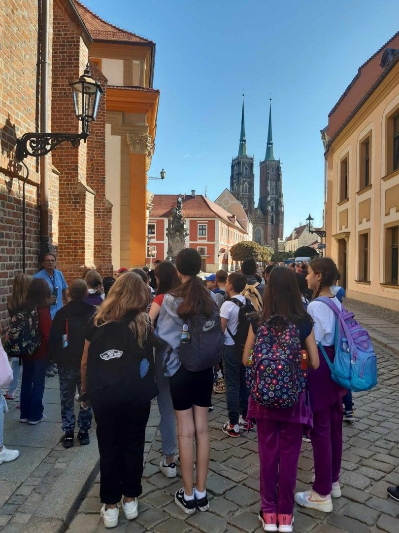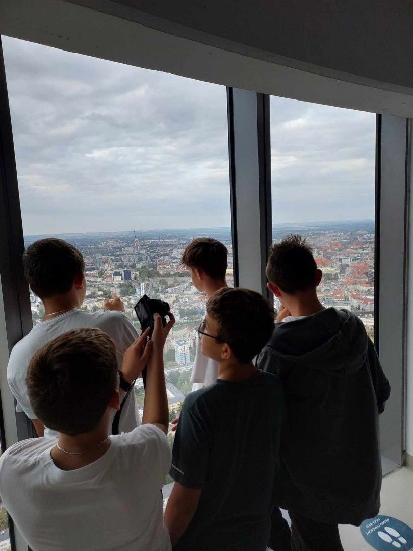 Na początku wycieczki uczniowie zwiedzali z przewodnikiem: Stare Miasto z kolorowymi kamienicami, późnogotycki Ratusz, Plac Solny z targiem kwiatowym, Stare Jatki z pracowniami najlepszych wrocławskich artystów oraz najstarszą część Wrocławia – Ostrów Tumski z Katedrą i mostem „miłości”. Piękna słoneczna pogoda towarzyszyła zwiedzającym przez cały dzień i sprzyjała poszukiwaniom wrocławskich krasnali. Duże wrażenie na uczestnikach wyjazdu zrobiła wizyta w Panoramie Racławickiej. Uczniowie przyswajali wiedzę zaprezentowaną w zupełnie innych okolicznościach. Kolejnym punktem wycieczki był wyjazd na punkt widokowy Sky Tower. Z 49 piętra, około 200 metrów nad ziemią każdy mógł zobaczyć Wrocław w całej okazałości. Po dniu pełnym wrażeń udaliśmy się do hotelu Jasek Premium, gdzie czekała na nas obiadokolacja w restauracji hotelowej. Po zakwaterowaniu w pokojach uczniowie mieli czas na integrację wzajemnie się odwiedzając.