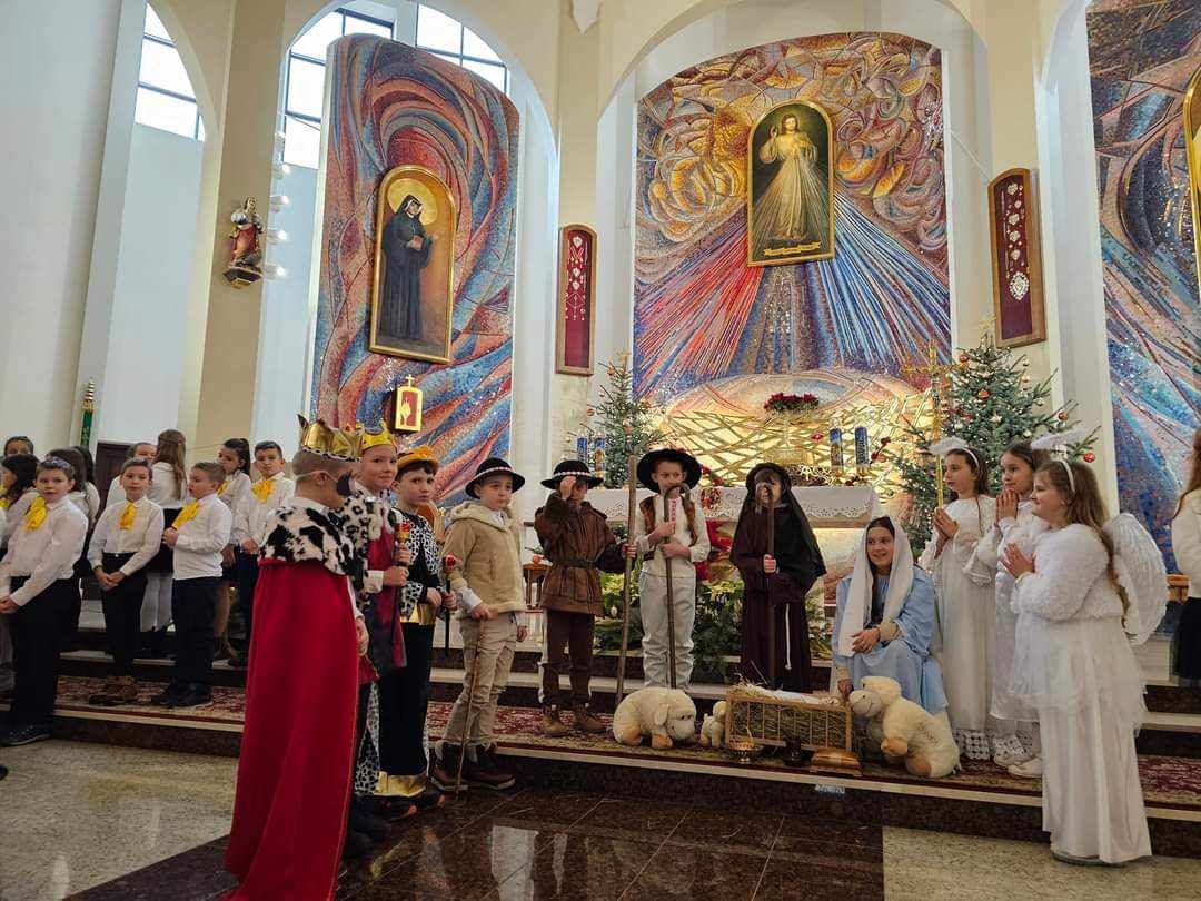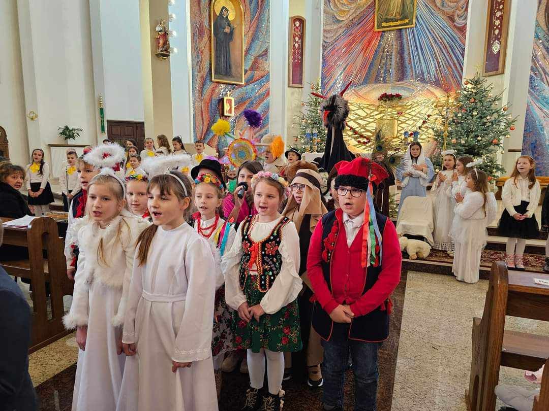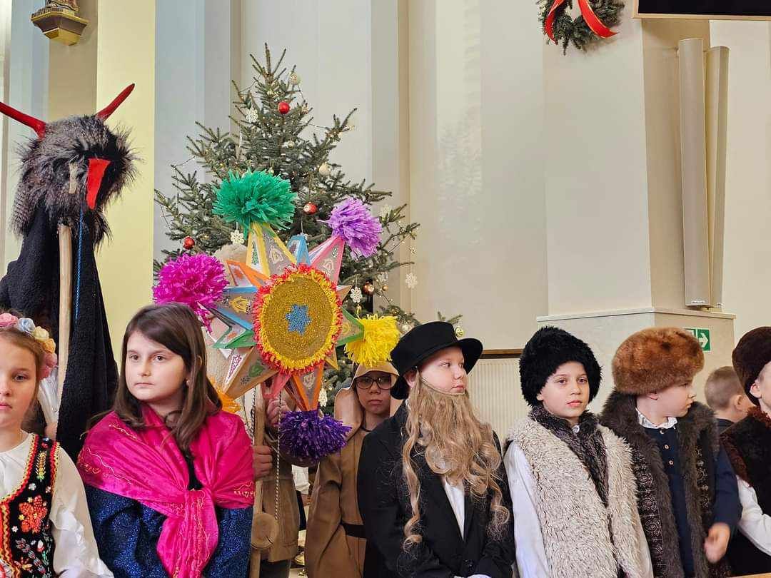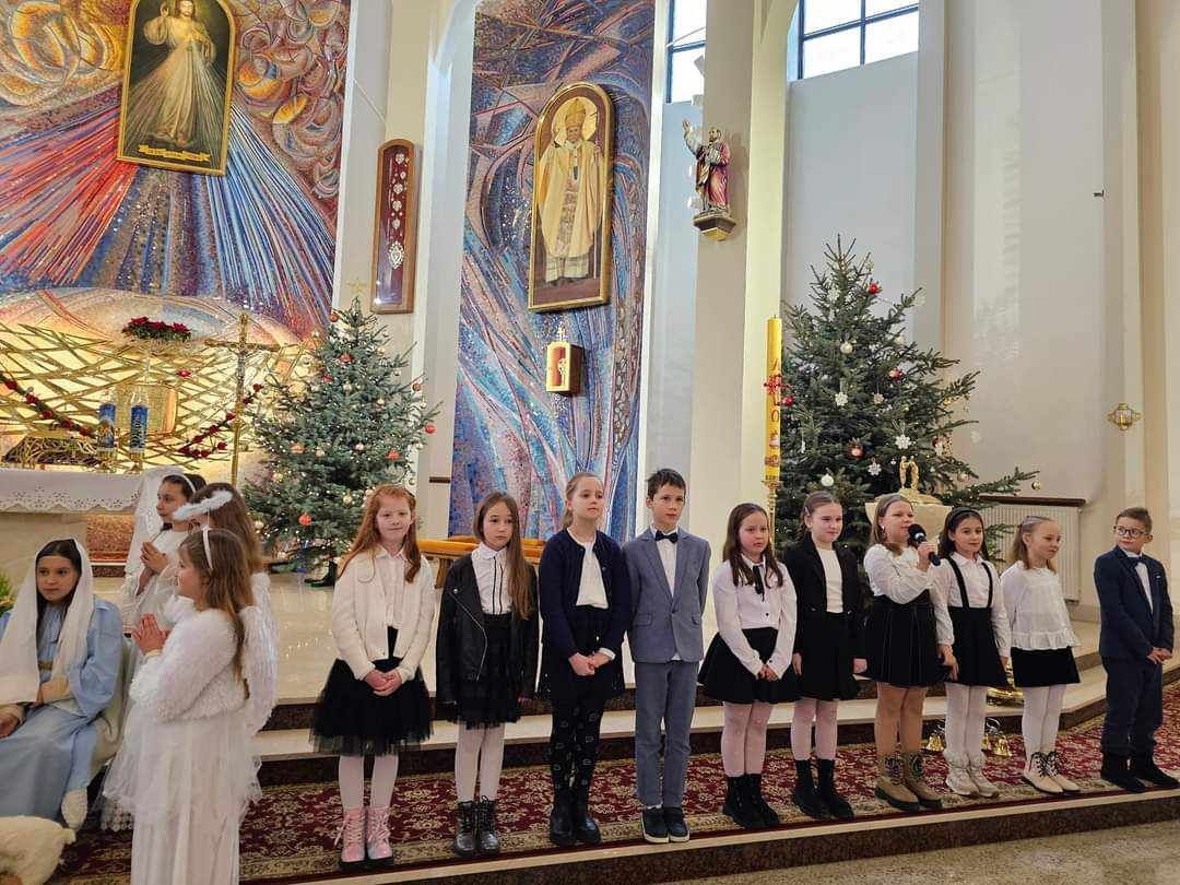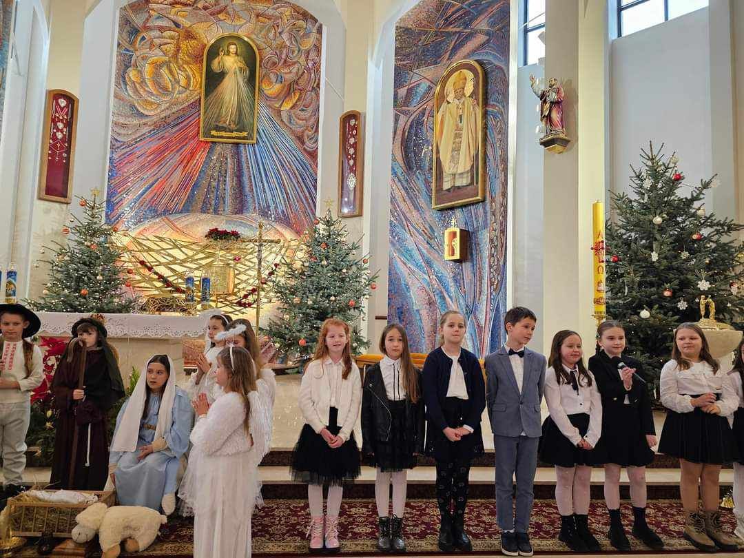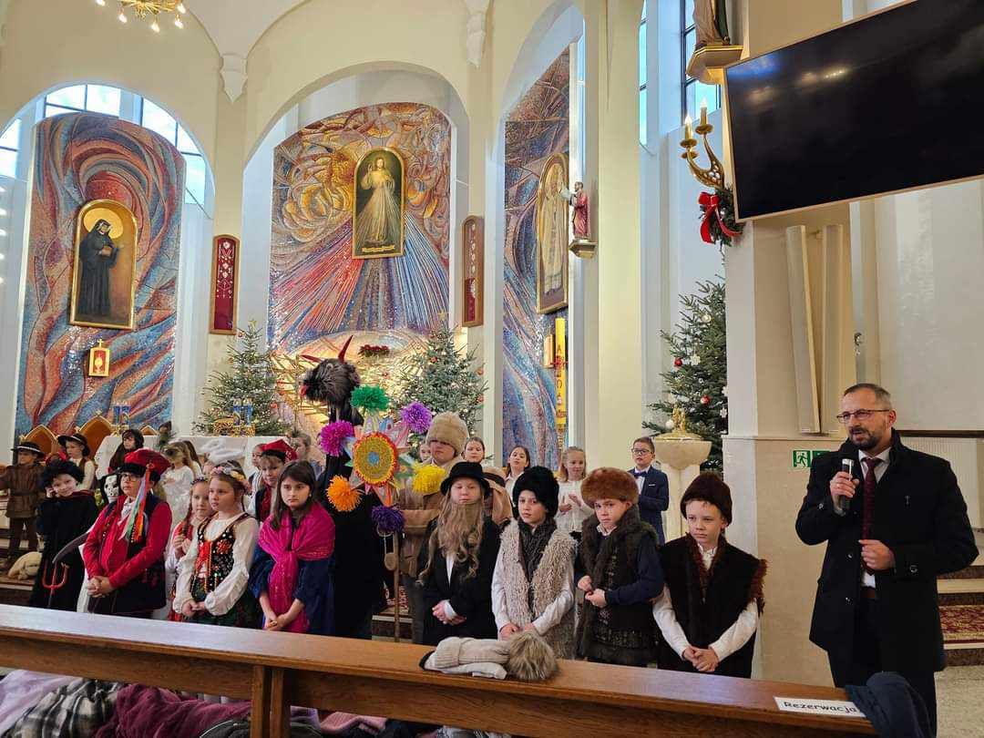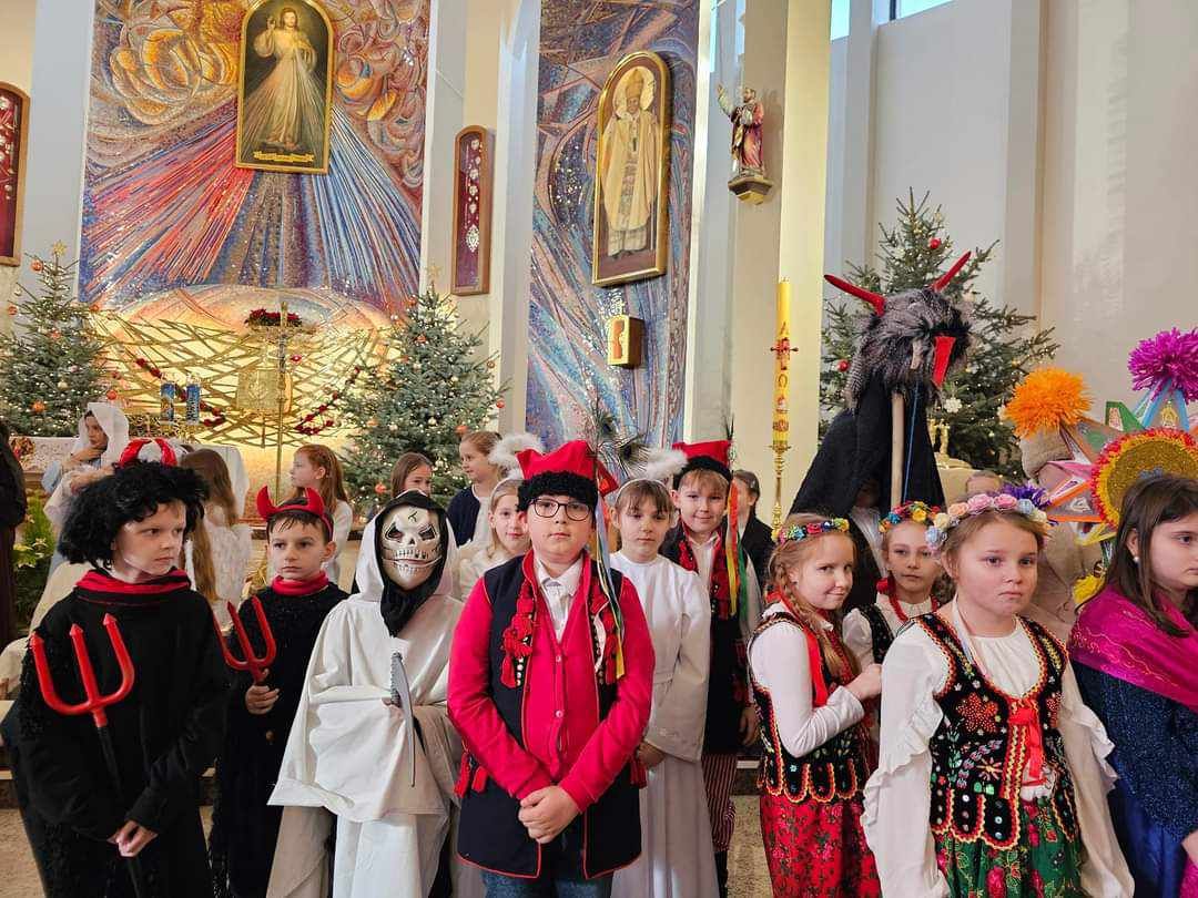 Spotkanie rozpoczęliśmy uroczystą mszą świętą pod przewodnictwem ks. Wojciecha Maślanki. Mszę uświetniał śpiew chóru pod opieką pani Marzeny Kasprzyk-Dudek. Następnie uczestniczyliśmy w jasełkach przygotowanych przez klasę 2 b, pod okiem pani Agaty Tomery. Za śpiew kolęd i pastorałek podczas jasełek odpowiedzialne były dzieci z klas trzecich. Przygotowała je pani Ewa Tomaszek oraz pani Kazimiera Matyasik. Grupa kolędnicza, w której znalazły się tradycyjne postacie z jasełek m.in. żyd, diabeł, turoń, pastuszkowie, złożyła na końcu życzenia wszystkim zebranym w kościele: