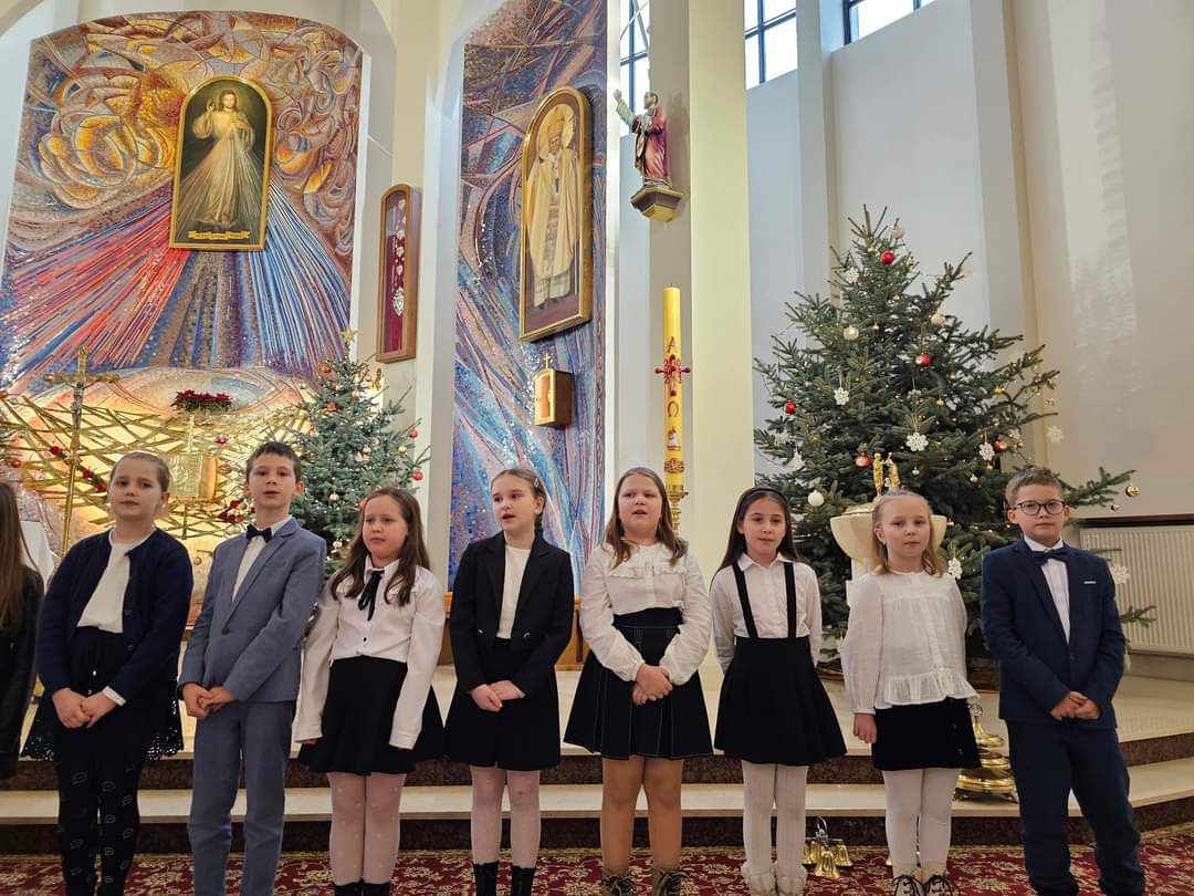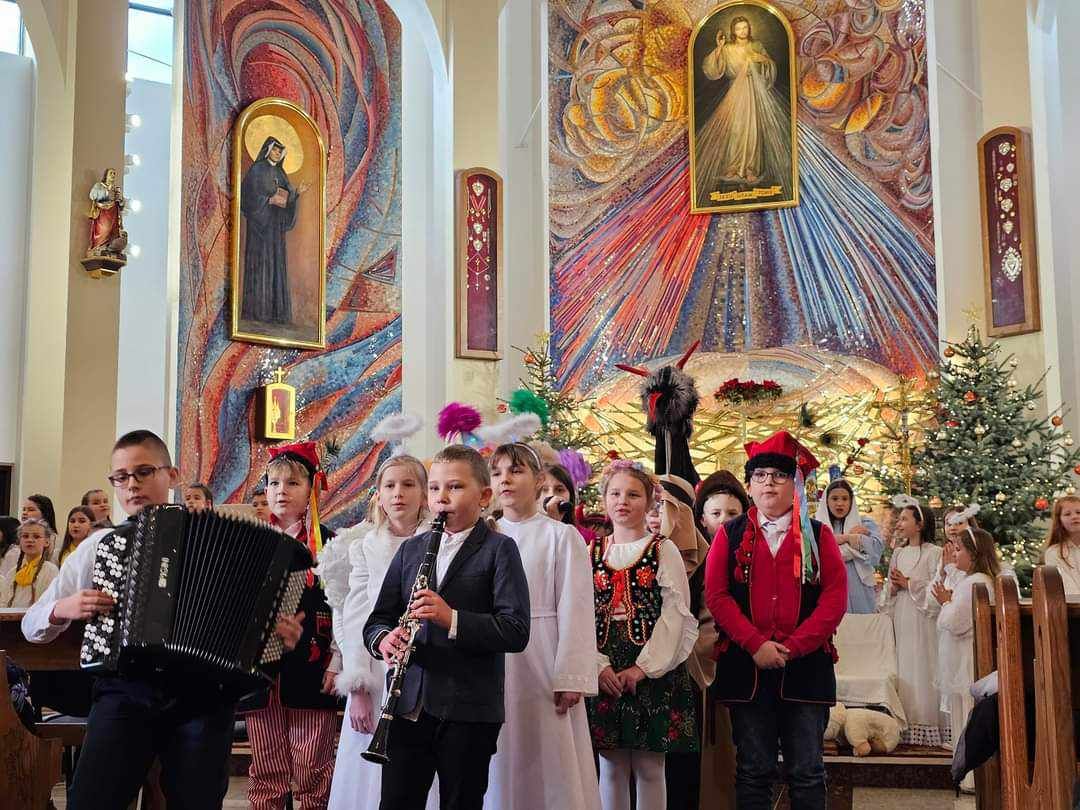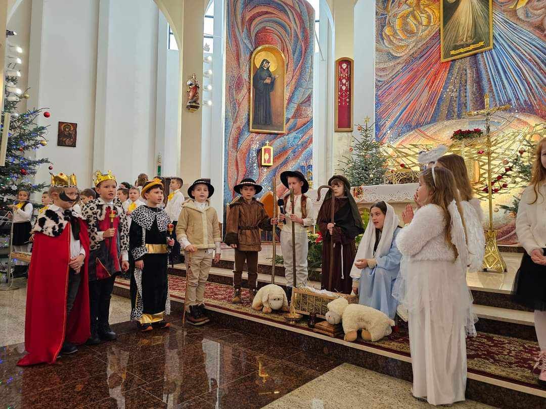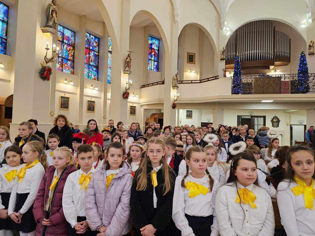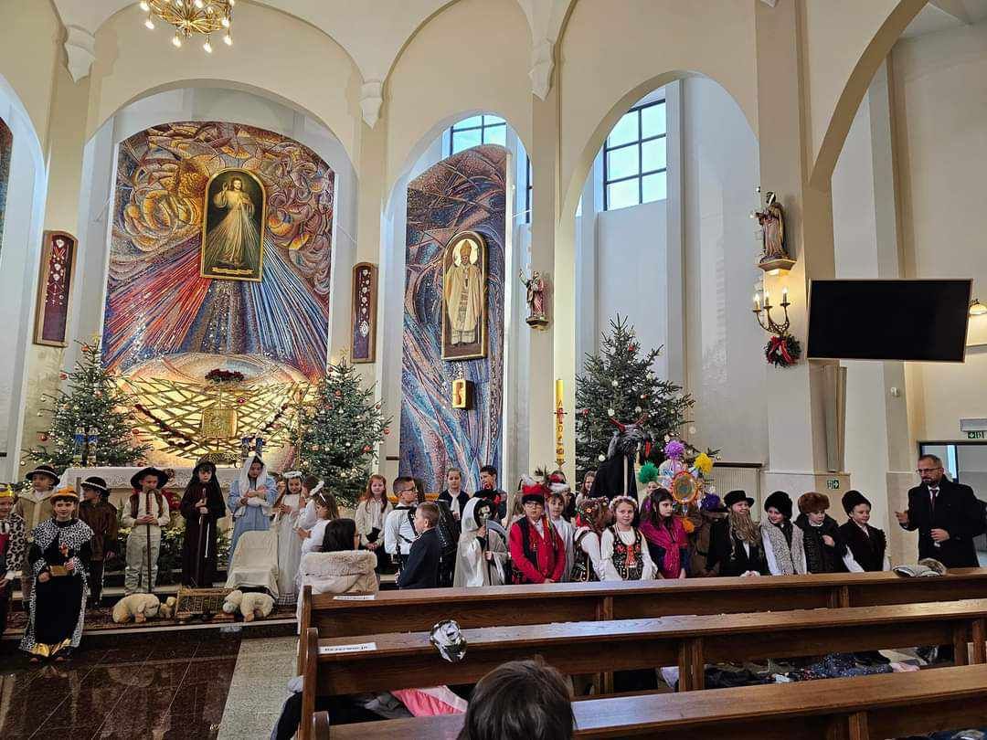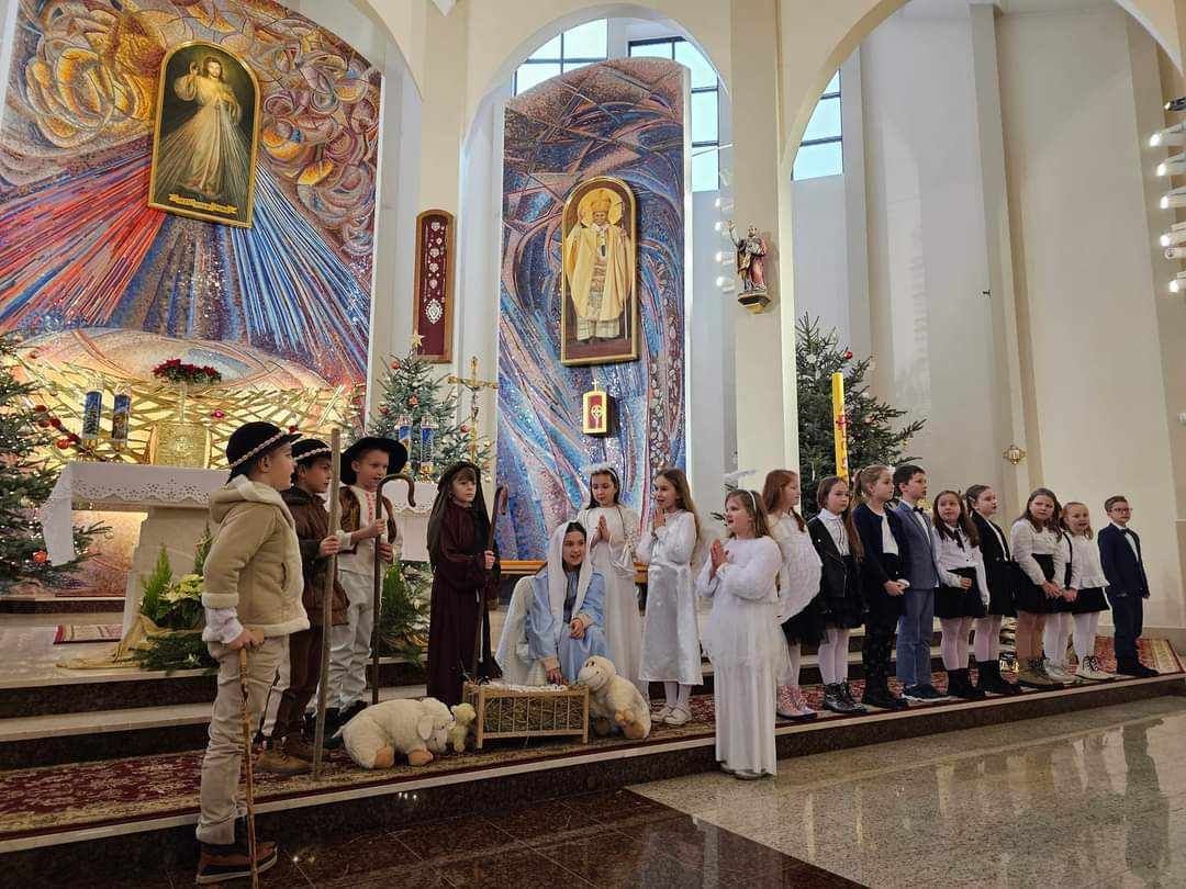 Spotkanie rozpoczęliśmy uroczystą mszą świętą pod przewodnictwem ks. Wojciecha Maślanki. Mszę uświetniał śpiew chóru pod opieką pani Marzeny Kasprzyk-Dudek. Następnie uczestniczyliśmy w jasełkach przygotowanych przez klasę 2 b, pod okiem pani Agaty Tomery. Za śpiew kolęd i pastorałek podczas jasełek odpowiedzialne były dzieci z klas trzecich. Przygotowała je pani Ewa Tomaszek oraz pani Kazimiera Matyasik. Grupa kolędnicza, w której znalazły się tradycyjne postacie z jasełek m.in. żyd, diabeł, turoń, pastuszkowie, złożyła na końcu życzenia wszystkim zebranym w kościele: