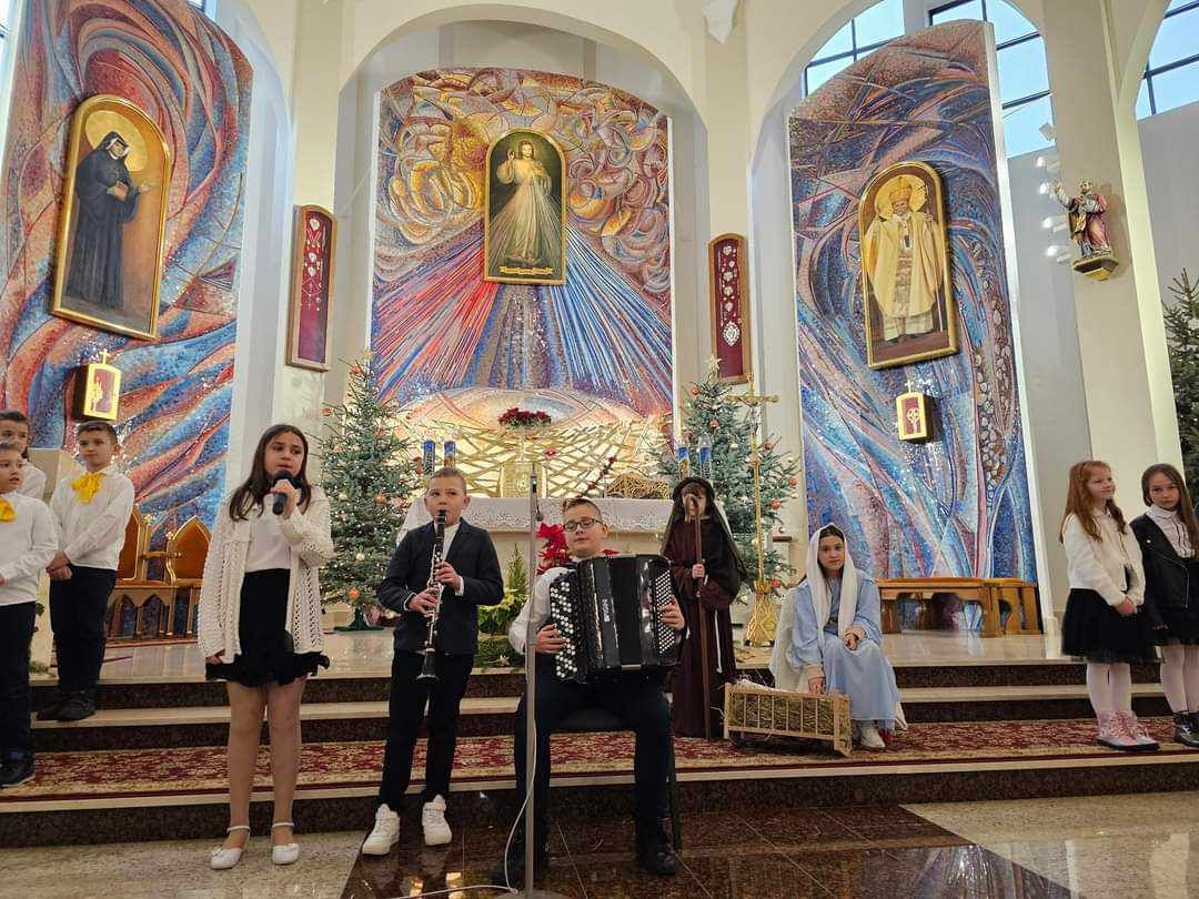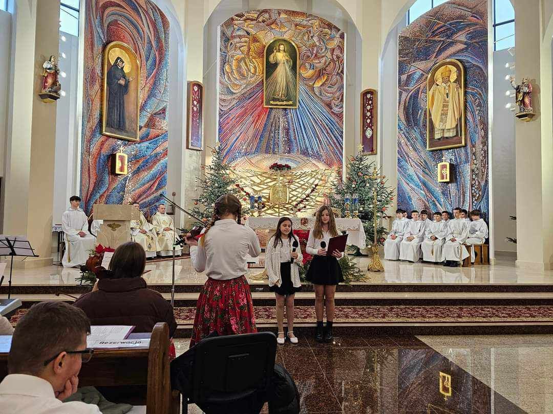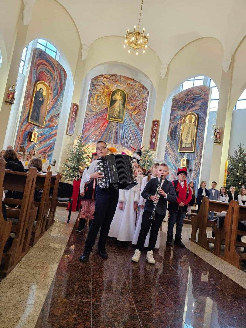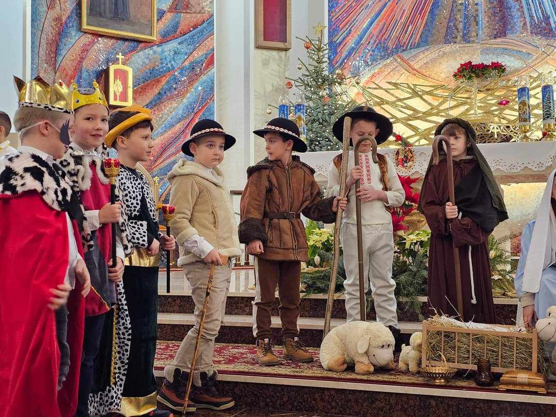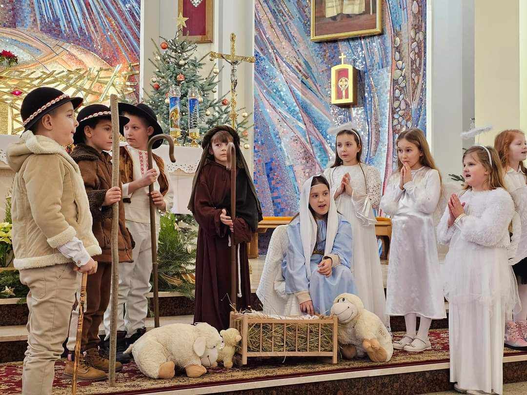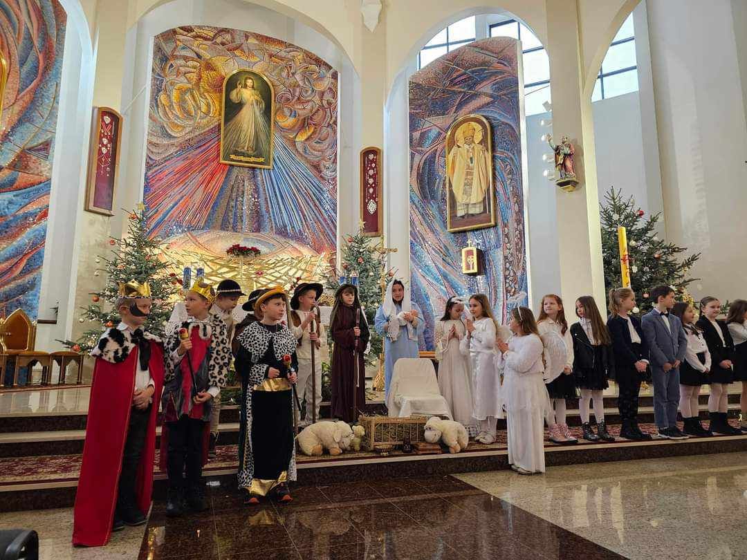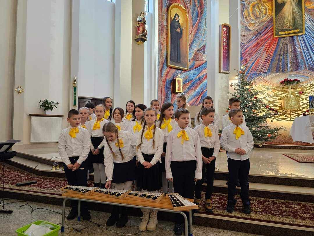 Spotkanie rozpoczęliśmy uroczystą mszą świętą pod przewodnictwem ks. Wojciecha Maślanki. Mszę uświetniał śpiew chóru pod opieką pani Marzeny Kasprzyk-Dudek. Następnie uczestniczyliśmy w jasełkach przygotowanych przez klasę 2 b, pod okiem pani Agaty Tomery. Za śpiew kolęd i pastorałek podczas jasełek odpowiedzialne były dzieci z klas trzecich. Przygotowała je pani Ewa Tomaszek oraz pani Kazimiera Matyasik. Grupa kolędnicza, w której znalazły się tradycyjne postacie z jasełek m.in. żyd, diabeł, turoń, pastuszkowie, złożyła na końcu życzenia wszystkim zebranym w kościele: