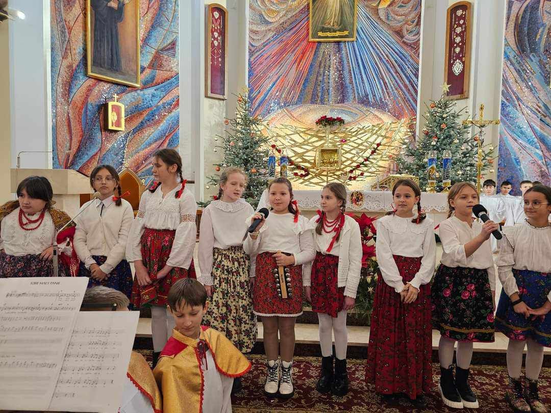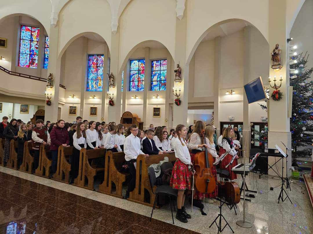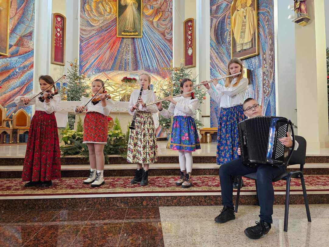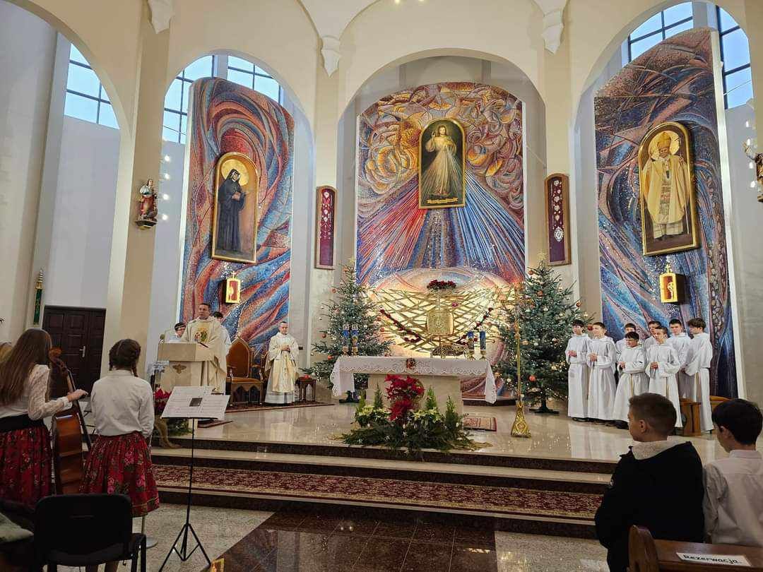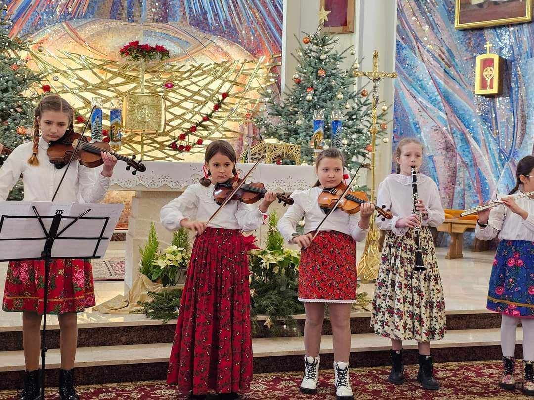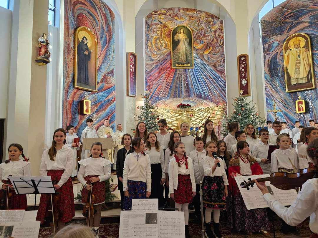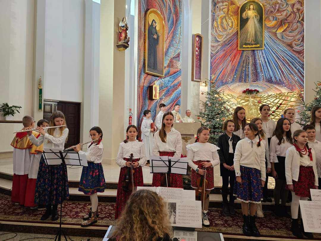 Spotkanie rozpoczęliśmy uroczystą mszą świętą pod przewodnictwem ks. Wojciecha Maślanki. Mszę uświetniał śpiew chóru pod opieką pani Marzeny Kasprzyk-Dudek. Następnie uczestniczyliśmy w jasełkach przygotowanych przez klasę 2 b, pod okiem pani Agaty Tomery. Za śpiew kolęd i pastorałek podczas jasełek odpowiedzialne były dzieci z klas trzecich. Przygotowała je pani Ewa Tomaszek oraz pani Kazimiera Matyasik. Grupa kolędnicza, w której znalazły się tradycyjne postacie z jasełek m.in. żyd, diabeł, turoń, pastuszkowie, złożyła na końcu życzenia wszystkim zebranym w kościele: