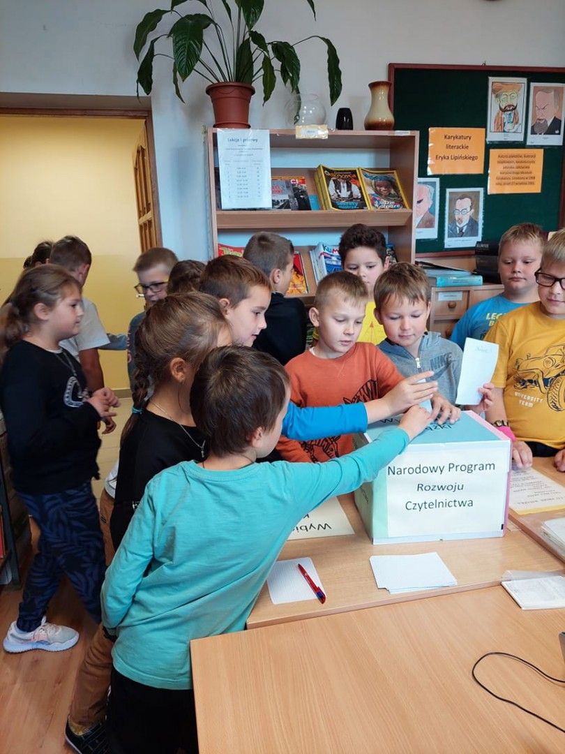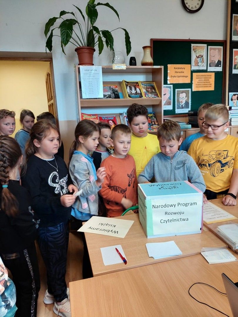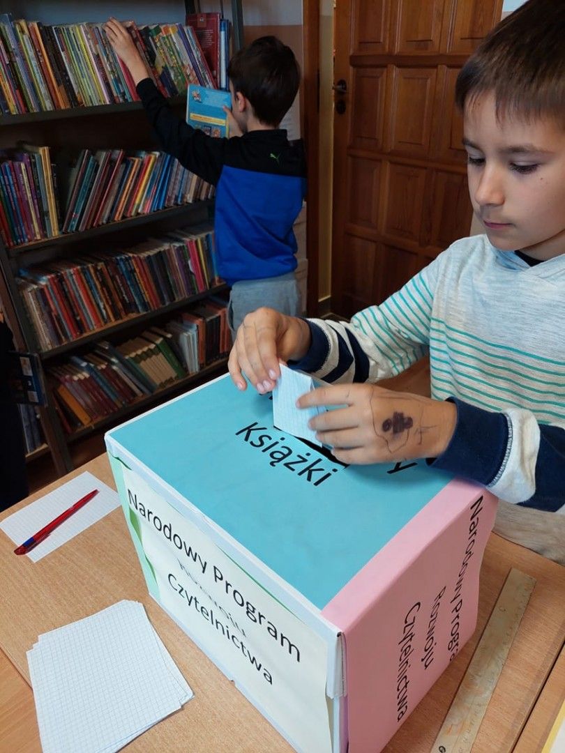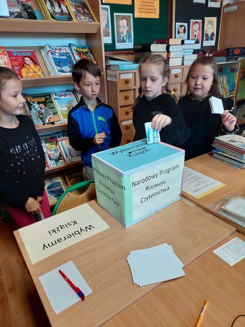 W bibliotece przeprowadzono „wybory książek” żeby uzyskać wiedzę na temat, jakie książki uczniowie lubią czytać, jakich autorów preferują. Poprzez wrzuconą do pudełka karteczkę uczniowie pomogli nauczycielowi bibliotekarzowi w przygotowaniu listy książek do zakupu. Poniżej można obejrzeć, jak wyglądały „wybory książek”.