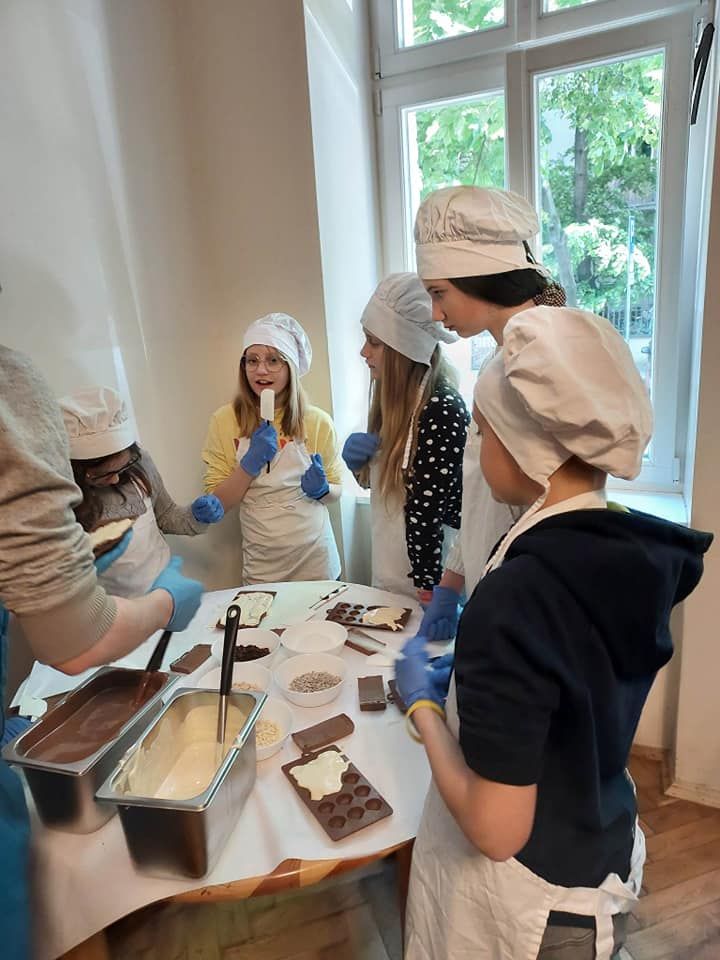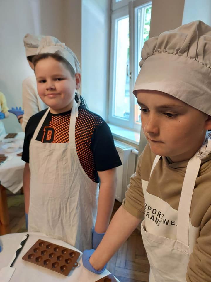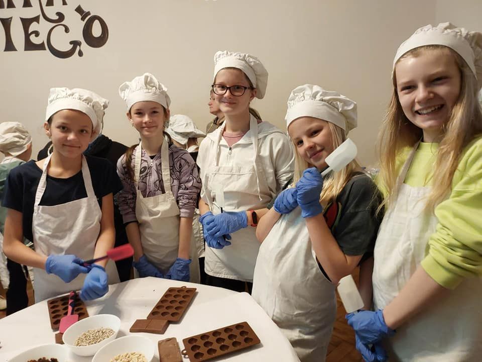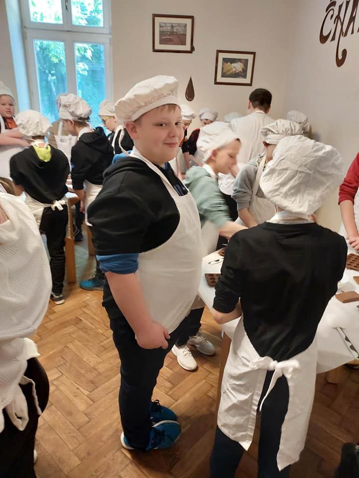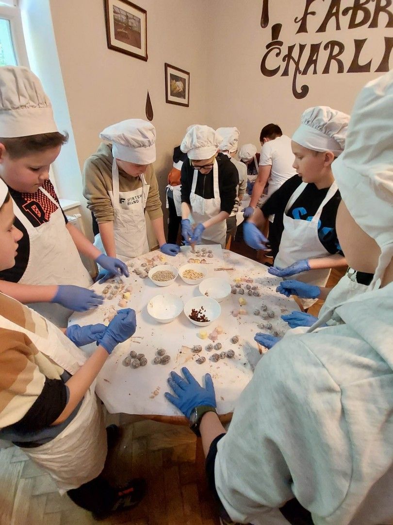 Nasza wycieczka rozpoczęła się od wizyty w Fabryce Charliego, gdzie uczniowie wcielili się w rolę deserantów. Na początku założyli stroje cukiernicze, fartuszek i czapkę, a następnie zapoznali się z historią i technologią produkcji czekolady. Bogaci w wiedzę przeszli do działania wykonując własnoręcznie słodkości. Pralinki zostały wykonane z wielkim zaangażowaniem i kreatywnością, a następnie spakowane do torebek, aby mogli ich spróbować najbliżsi z rodzin uczestników. W dobrych humorach udaliśmy się do Teatru Groteska przez Planty i Rynek Główny w Krakowie. Po krótkim spacerze w słoneczku przyszedł czas na spektakl. Po zajęciu wygodnych miejsc na balkonie uczniowie mieli okazję obejrzeć kryminalną komedię muzyczną „Kapelusz za sto tysięcy”. Opowieść była wciągająca, pełna humoru i niezwykłych wydarzeń.