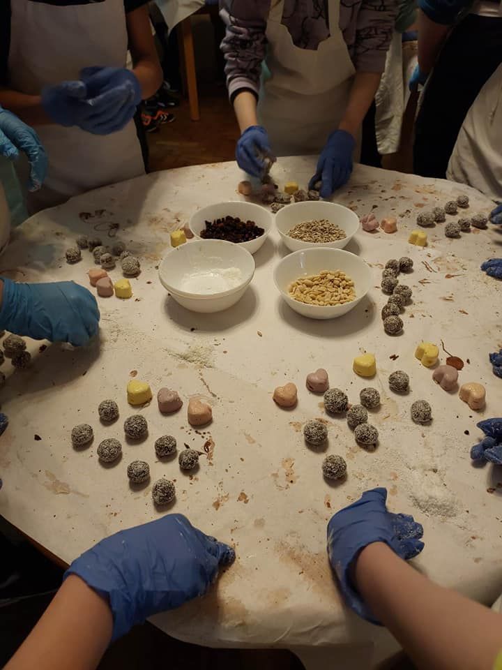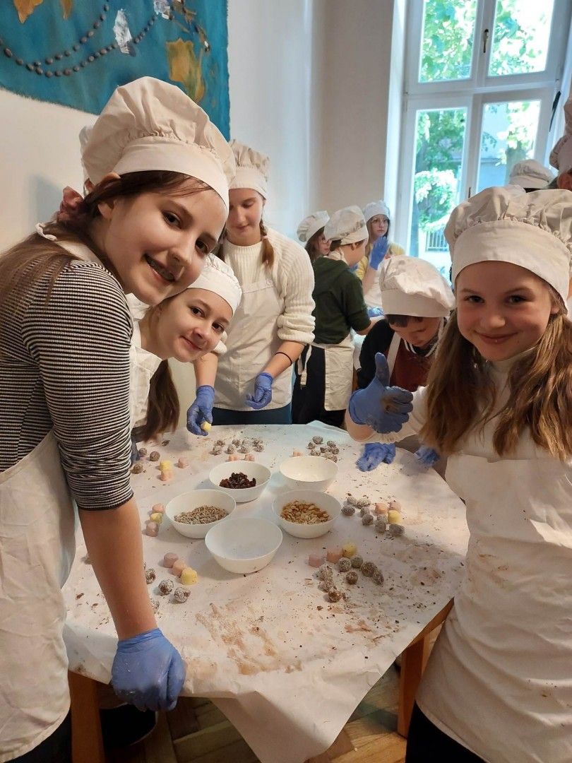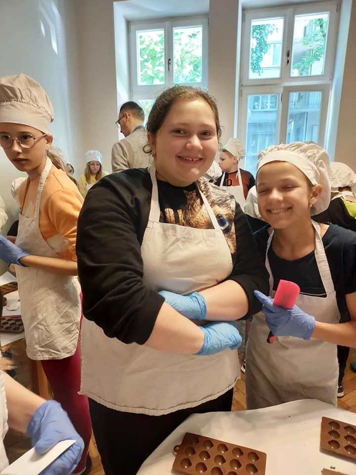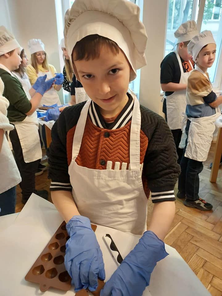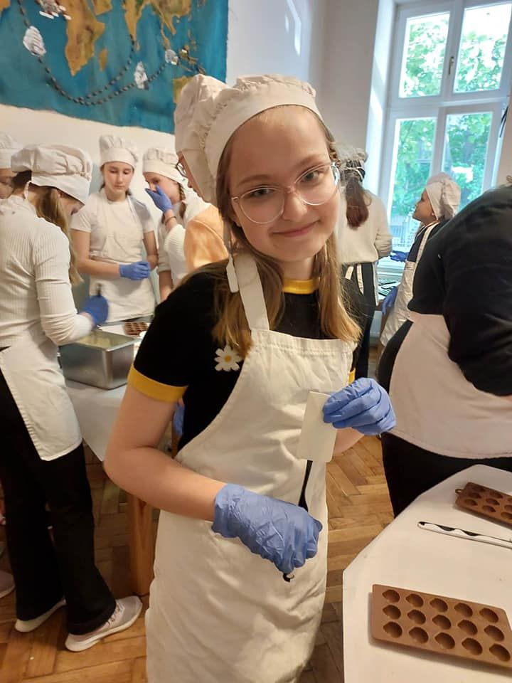 Nasza wycieczka rozpoczęła się od wizyty w Fabryce Charliego, gdzie uczniowie wcielili się w rolę deserantów. Na początku założyli stroje cukiernicze, fartuszek i czapkę, a następnie zapoznali się z historią i technologią produkcji czekolady. Bogaci w wiedzę przeszli do działania wykonując własnoręcznie słodkości. Pralinki zostały wykonane z wielkim zaangażowaniem i kreatywnością, a następnie spakowane do torebek, aby mogli ich spróbować najbliżsi z rodzin uczestników. W dobrych humorach udaliśmy się do Teatru Groteska przez Planty i Rynek Główny w Krakowie. Po krótkim spacerze w słoneczku przyszedł czas na spektakl. Po zajęciu wygodnych miejsc na balkonie uczniowie mieli okazję obejrzeć kryminalną komedię muzyczną „Kapelusz za sto tysięcy”. Opowieść była wciągająca, pełna humoru i niezwykłych wydarzeń.