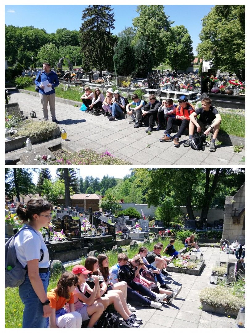 Ostatnim punktem programu było zwiedzanie cmentarza limanowskiego z panem Karolem Wojtasem. Historyk, zaczynając od kaplicy Marsów, przedstawił historię cmentarza, bazyliki limanowskiej i oprowadził uczniów po tym miejscu pochówków, zwracając raz po raz ich uwagę na ciekawe nagrobki, epitafia, tablice, mogiły oraz opowiadając o życiu osób zmarłych. Nie zapomnieliśmy również o modlitwie oraz zapaleniu znicza. Była to interesująca i pouczająca lekcja historii, dzięki której dowiedzieliśmy się wielu rzeczy m.in. że w tej nekropolii znajduje się grób powstańca, który wrócił z Syberii i był całowany przez dzieci po rękach, mogiła olimpijczyka, symboliczny nagrobek ofiar Auschwitz, cmentarzyk z czasów I wojny światowej.