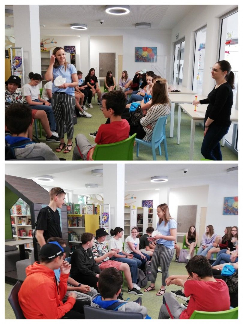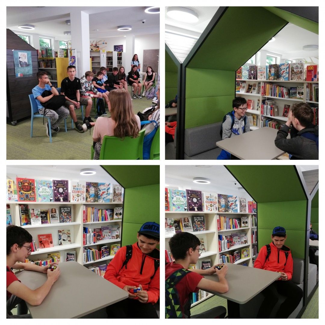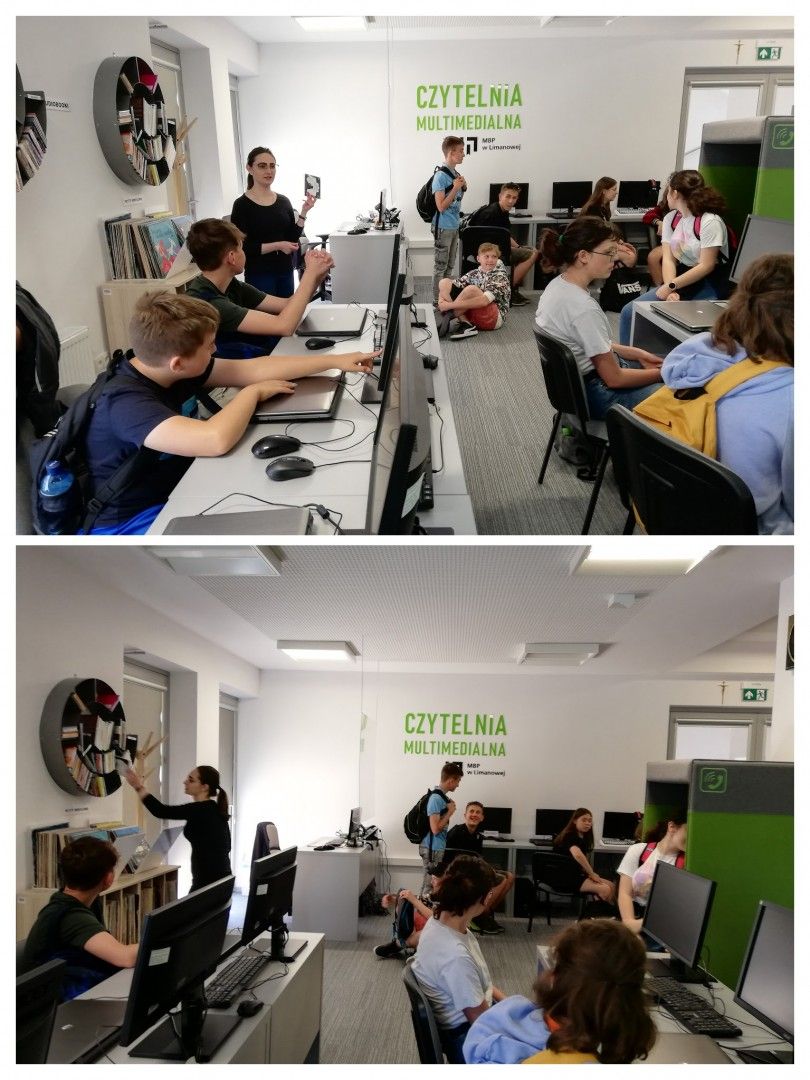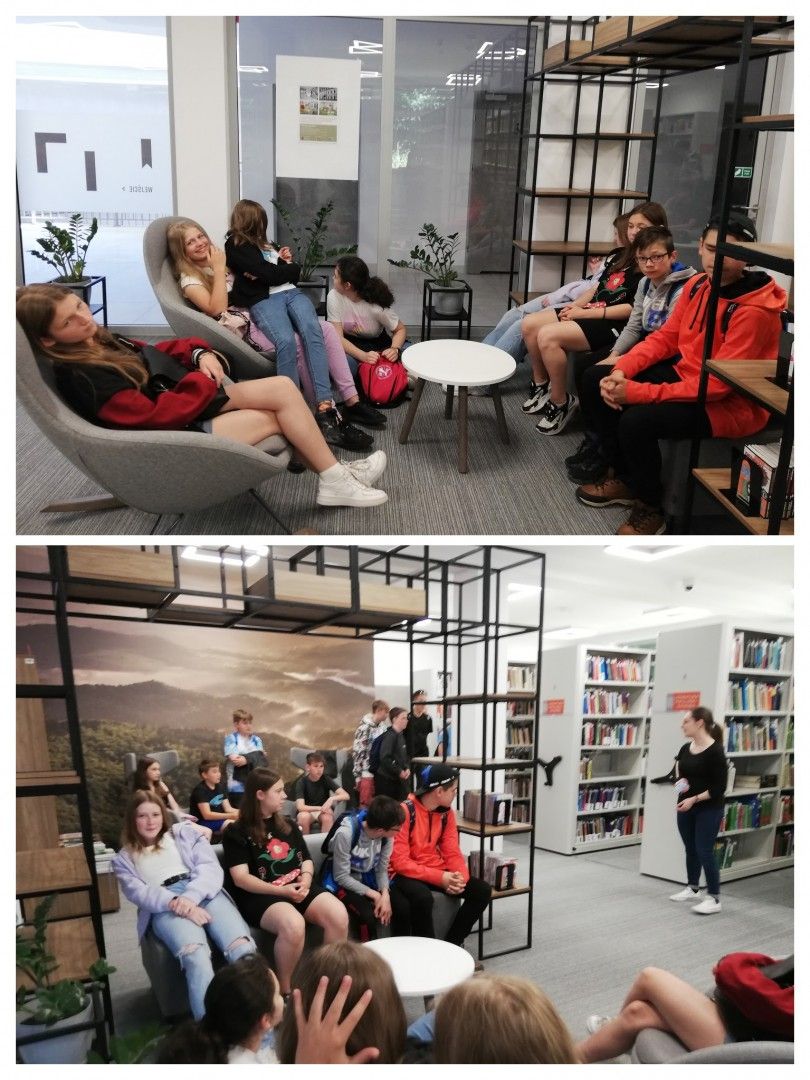 Następnie uczniowie zostali oprowadzeni przez miłą panią bibliotekarkę Annę Górkę po nowoczesnej bibliotece limanowskiej działającej przy LDK. Dowiedzieli się, jak działa książkomat oraz wrzutnia książek. Buszowali między półkami pełnymi ciekawych książek, gier, puzzli. Oglądali je, komentowali, grali. Wzięli także udział w lekcji „Multimedialne źródła informacji”, podczas której poznali historię biblioteki w Limanowej, uczyli się m.in. jak korzystać z katalogów cyfrowych oraz jak elektronicznie zamawiać książki na https://limanowa-mbp.sowa.pl Na koniec odbyła się zabawa w kręgu – quiz wiedzy 5 sekund na temat książek, pisarzy, zachowania się w bibliotece. Wszyscy zostali nagrodzeni zakładkami. Kilku chętnych uczniów założyło kartę biblioteczną, a niektórzy, zaznajomieni z książnicą wcześniej, deklarowali, że już ją mają. Wizyta w tym przyjemnym miejscu z pewnością ośmieli nieprzekonanych do ponownych, tym razem samodzielnych, odwiedzin.