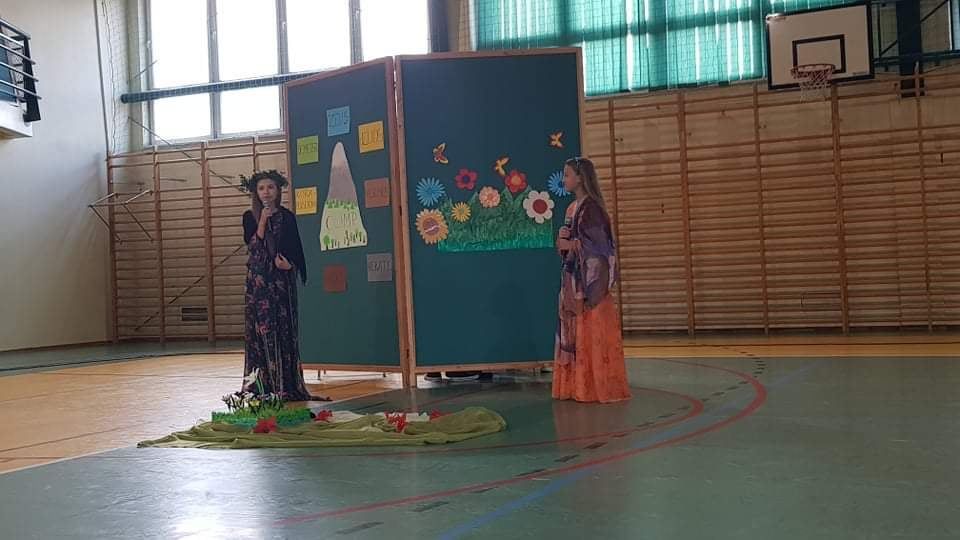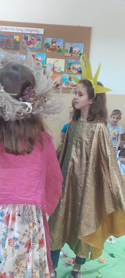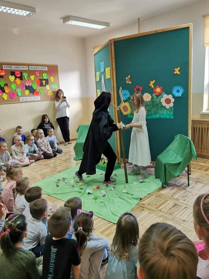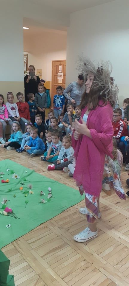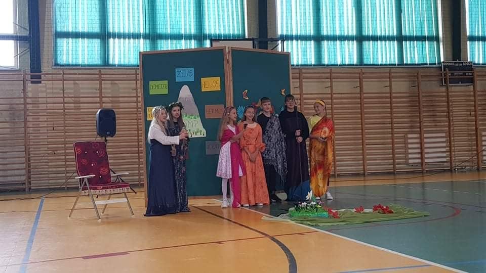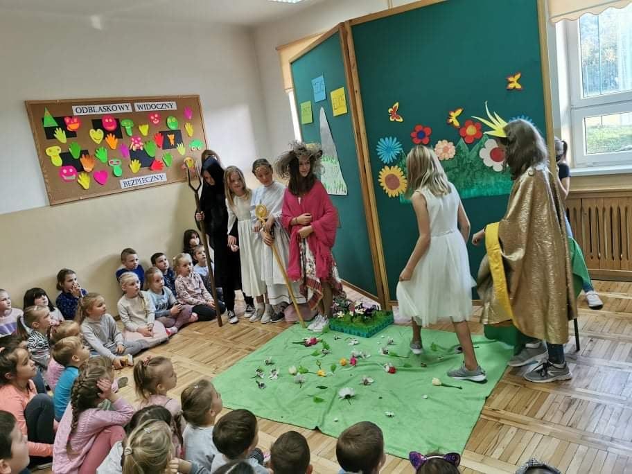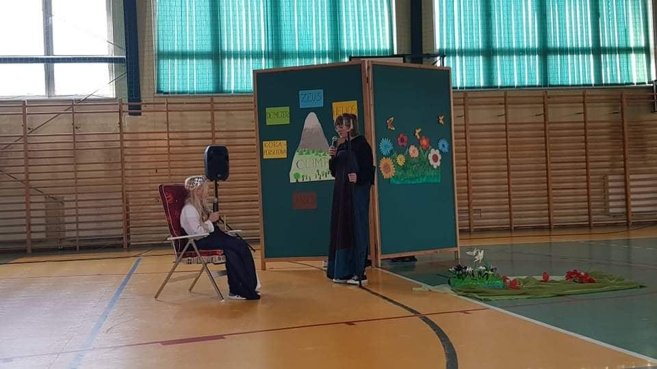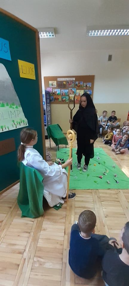 Klasa V b w dniu 19 października wystawiła spektakl dla swoich młodszych kolegów z klas 0-3. Przedszkolaki i dzieci z klas młodszych z uwagą słuchali słów wstępu pani Edyty Odziomek, która przedstawiła bohaterów i wyjaśniła znaczenie mitu. Następnie obejrzały przedstawienie, które bardzo im się podobało. W role wcieliły się:
