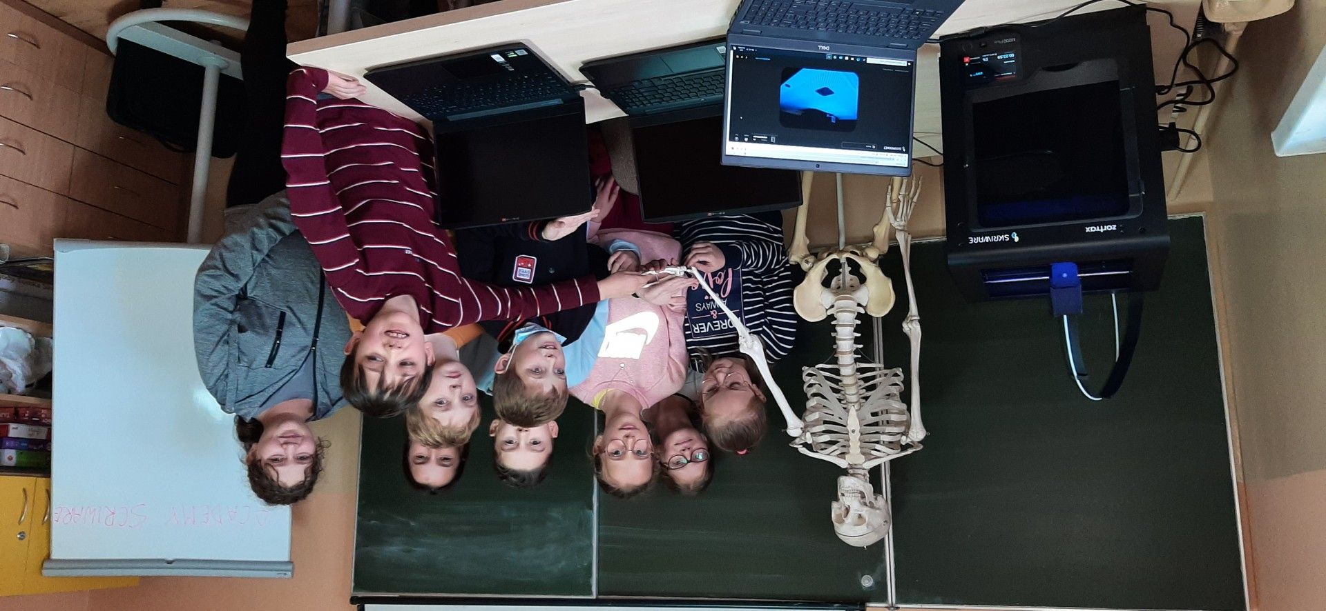 W czasie pracy drukarki uczniowie poznawali budowę oraz funkcję szkieletu człowieka na rzeczywistym modelu. Następnie oglądali prezentację oraz uzupełniali „mapy myśli” dotyczące szkieletu człowieka ze skriware academy. Na zakończenie rozwiązywali test w Quizizz. Nagrodą za 1 miejsce był wydrukowany breloczek w drukarce 3D.