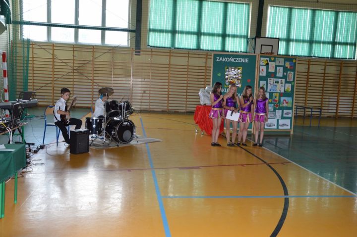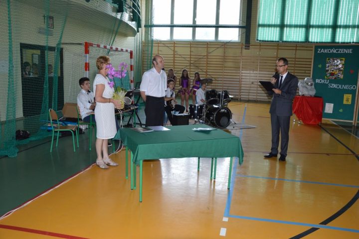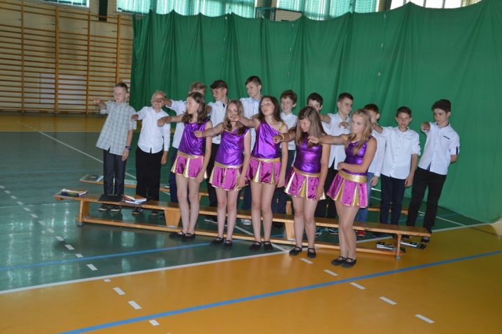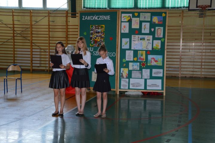Po mszy świętej na hali sportowej zebrali się uczniowie szkoły podstawowej. Tym razem to szóstoklasiści żegnali społeczność szkolną. Podziękowali za opiekę, pomoc w zdobywaniu wiadomości i rozwijaniu talentów, którymi postanowili się pochwalić. Pokazali przedstawienie pt. "Czerwony kapturek szuka księcia", następnie kilka osób zagrało i zaśpiewało przebój Renegate, a na końcu dziewczyny przedstawiły przygotowany przez siebie układ taneczny. Po części artystycznej nastąpiło ślubowanie i przekazanie sztandaru przedstawicielom klas piątych. Pan Dyrektor rozdał uczniom świadectwa, wręczył nagrody, podziękował tym, którzy odnieśli sukcesy w bieżącym roku szkolnym. Szóstoklasiści zostali obdarowani przez młodszych kolegów słodkościami i drobnym upominkiem.