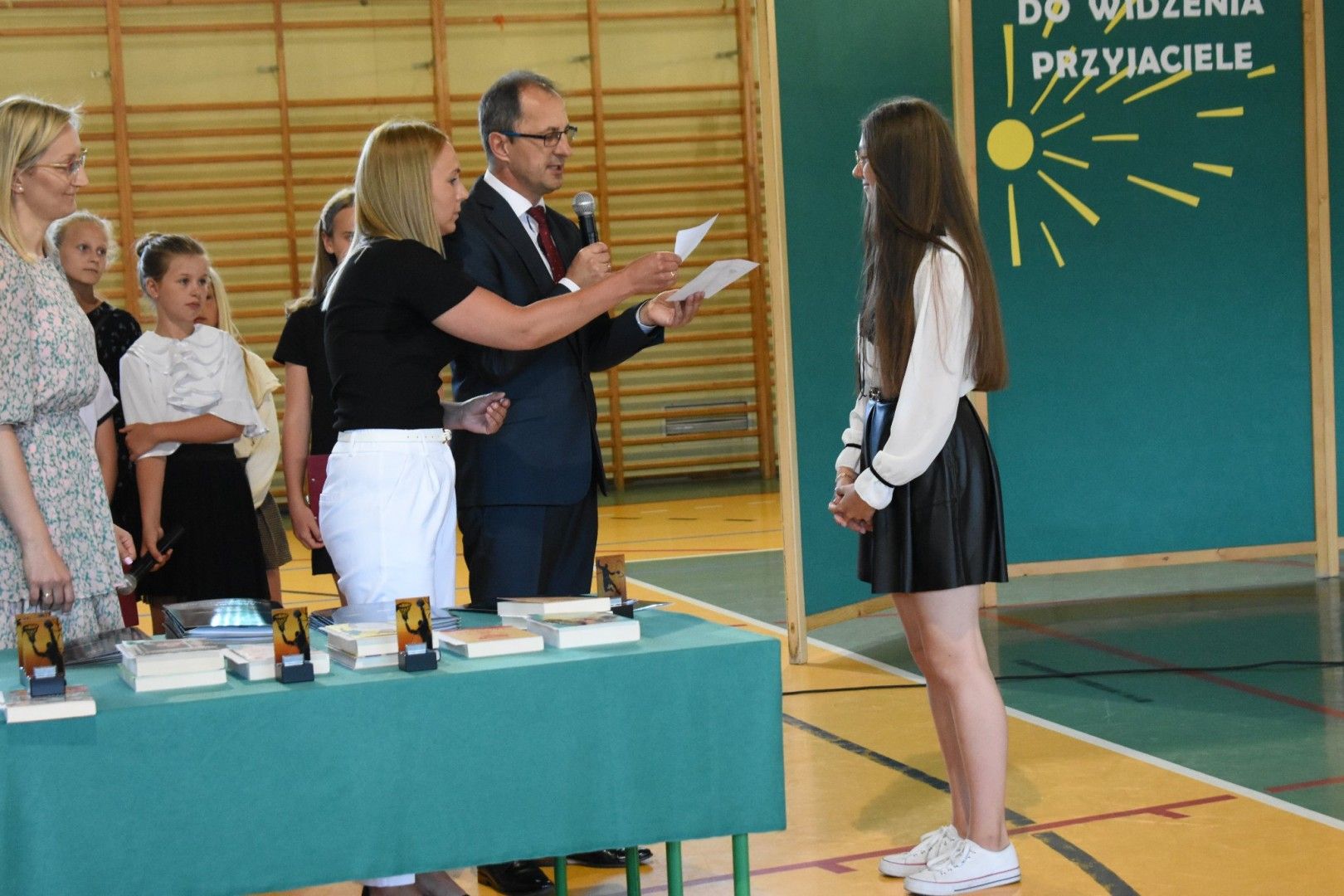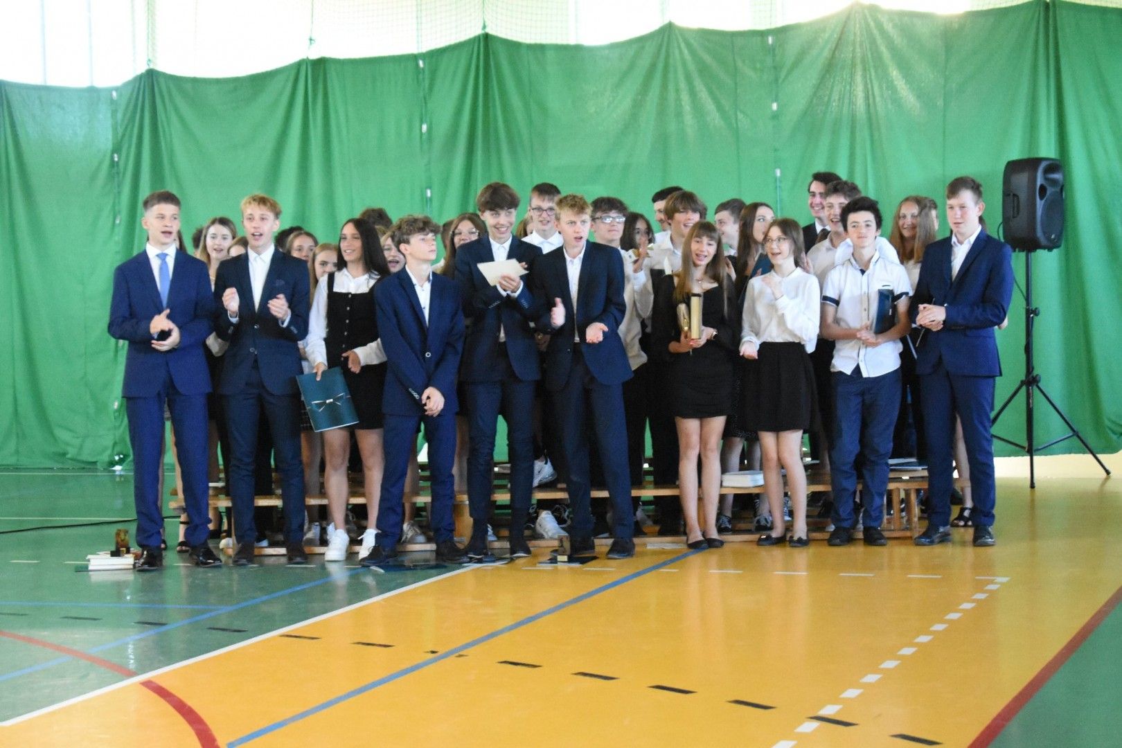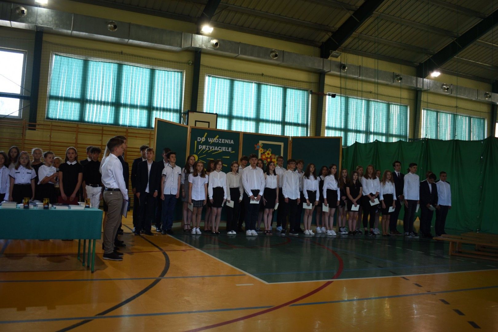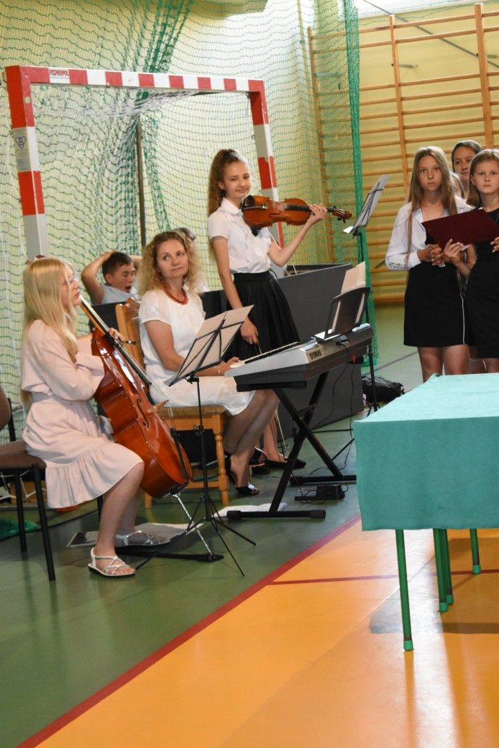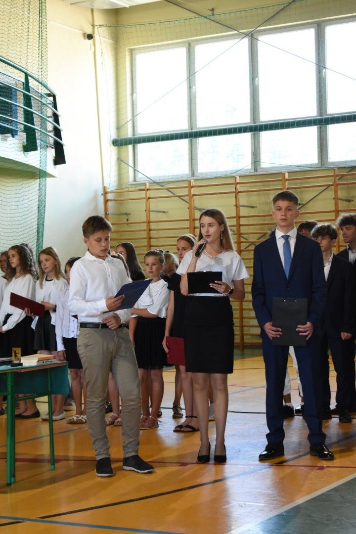 Dyrektor szkoły wraz z wychowawcami wręczyli absolwentom świadectwa, świadectwa z wyróżnieniem, nagrody za reprezentowanie szkoły w konkursach i zawodach sportowych, listy gratulacyjne i podziękowania dla rodziców. Z ust ósmoklasistów płynęły słowa wdzięczności i podziękowania za trud wychowania, kształcenia i nauczania, za sukcesy, za opiekę na każdym kroku, za cierpliwość, wyrozumiałość. Szczególnie wzruszającym momentem było pożegnanie pani Emilii Kolawy, naszej pani bibliotekarki, która odeszła na emeryturę. Po akademii uczniowie spotkali się na krótką chwilę z wychowawcami i wreszcie udali się na zasłużony wypoczynek.
