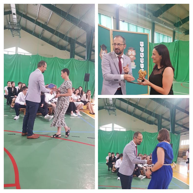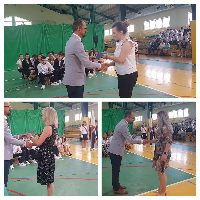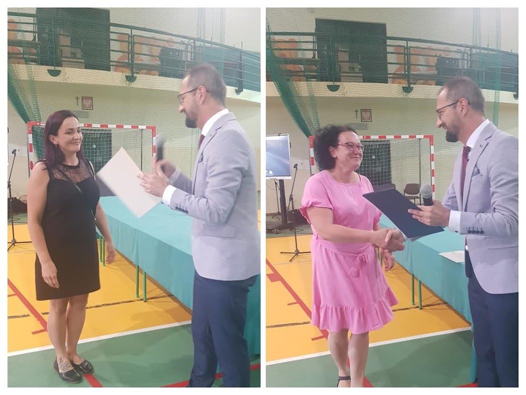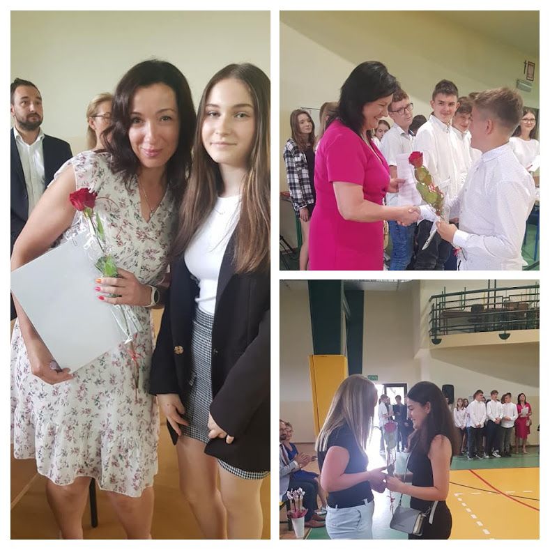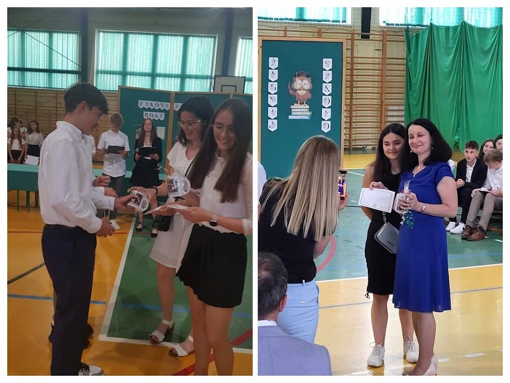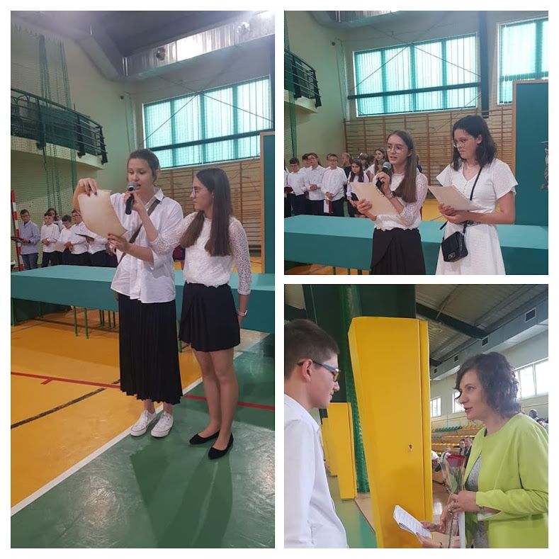 Pozostałym uczniom na hali dyrekcja i wychowawcy wręczyli świadectwa z wyróżnieniem i nagrody książkowe oraz życzyli bezpiecznych, słonecznych, ciekawych wakacji. Dwóm paniom przyznano tytuł „przyjaciela szkoły” – p. Marioli Szubryt i p. Małgorzacie Kubik.