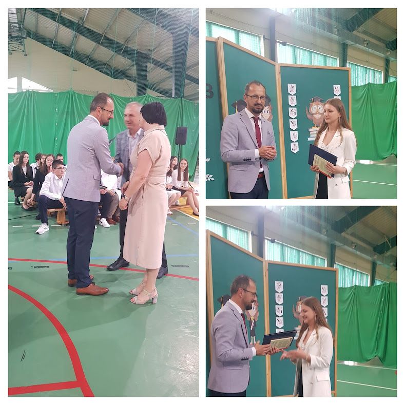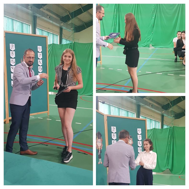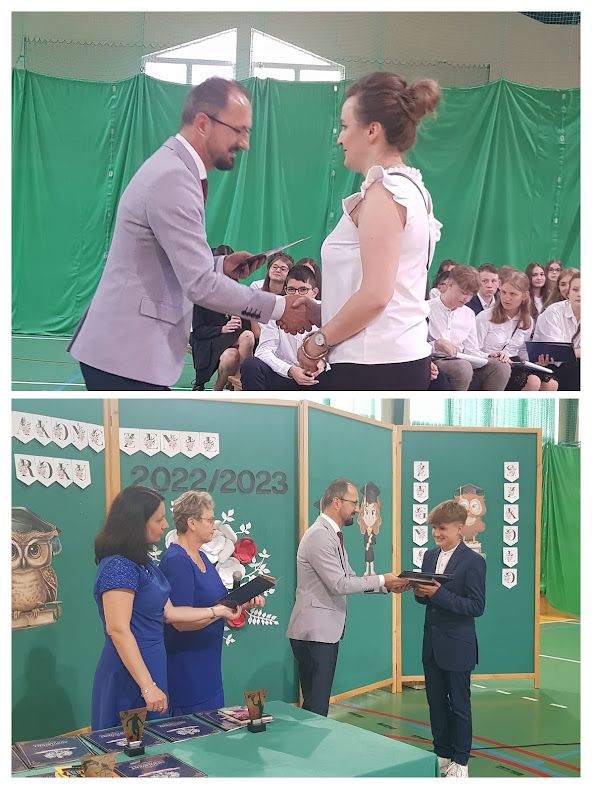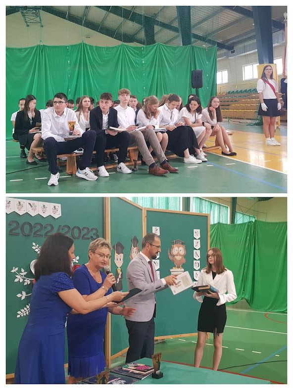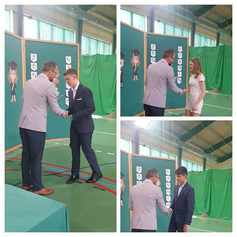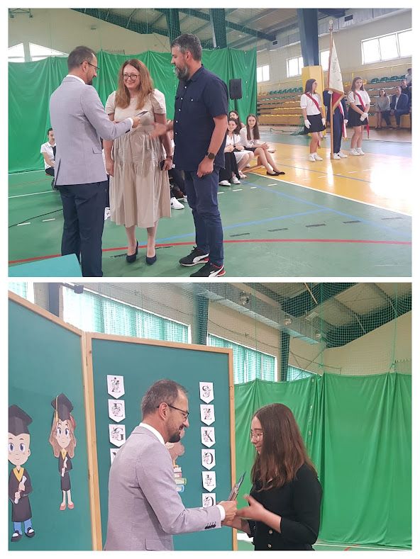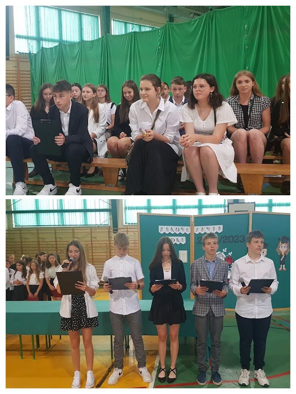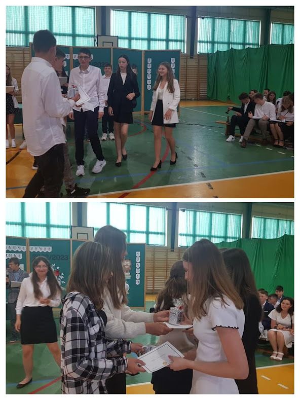 Pozostałym uczniom na hali dyrekcja i wychowawcy wręczyli świadectwa z wyróżnieniem i nagrody książkowe oraz życzyli bezpiecznych, słonecznych, ciekawych wakacji. Dwóm paniom przyznano tytuł „przyjaciela szkoły” – p. Marioli Szubryt i p. Małgorzacie Kubik.