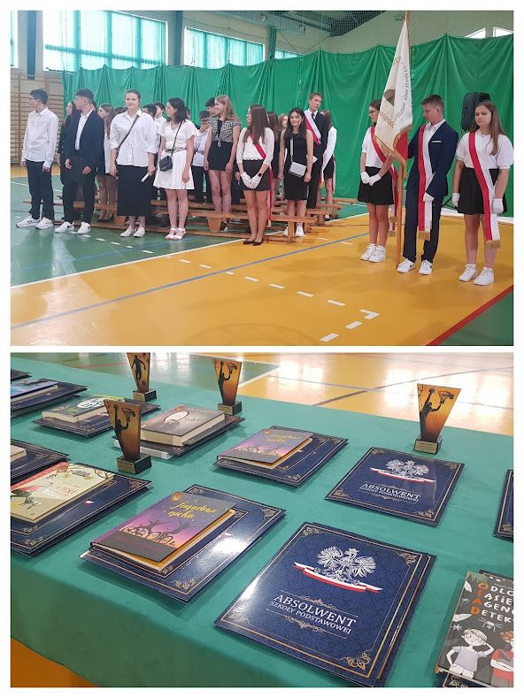 Następnie uczniowie klasy VIII i chór zaprezentowali program artystyczny. Przy pomocy wierszy, piosenek i zdjęć wspominali lata spędzone w szkolnych murach oraz dziękowali pracownikom placówki za okazaną życzliwość, pomoc, wsparcie, trud włożony w ich nauczanie i wychowanie, przyznając ordery i obdarowując kwiatami oraz sercami z piernika. Miłą niespodziankę dla absolwentów przygotowali uczniowie klasy VII, którzy krótko i trafnie scharakteryzowali każdego ósmoklasistę oraz pamiątkowym dyplomem i kubeczkiem ze zdjęciem pożegnali starszych kolegów. Po spotkaniu ogólnym uczniowie wraz z wychowawcą udali się do sali lekcyjnej, by we własnym gronie dokonać refleksji nad minionymi latami oraz podzielić się wakacyjnymi planami.